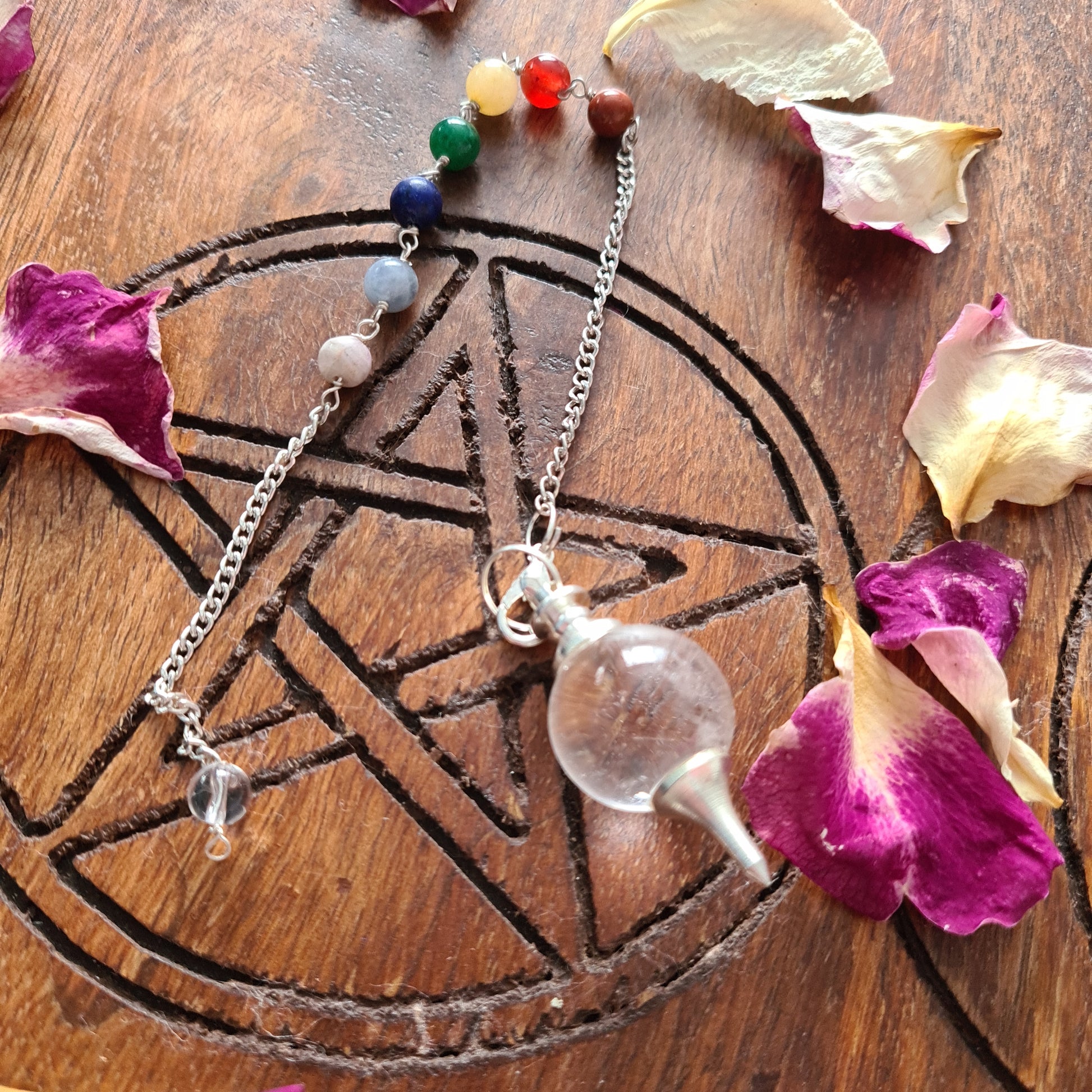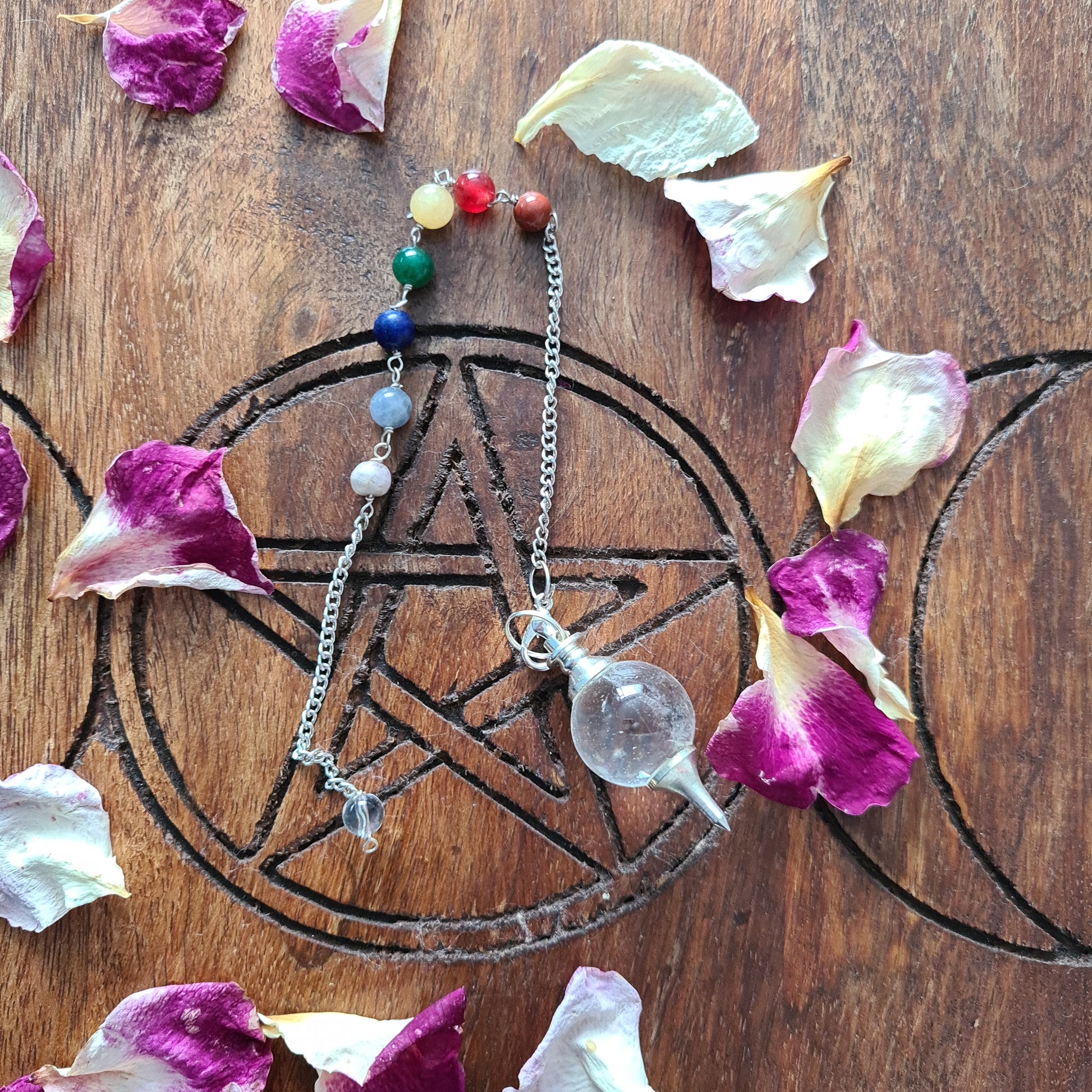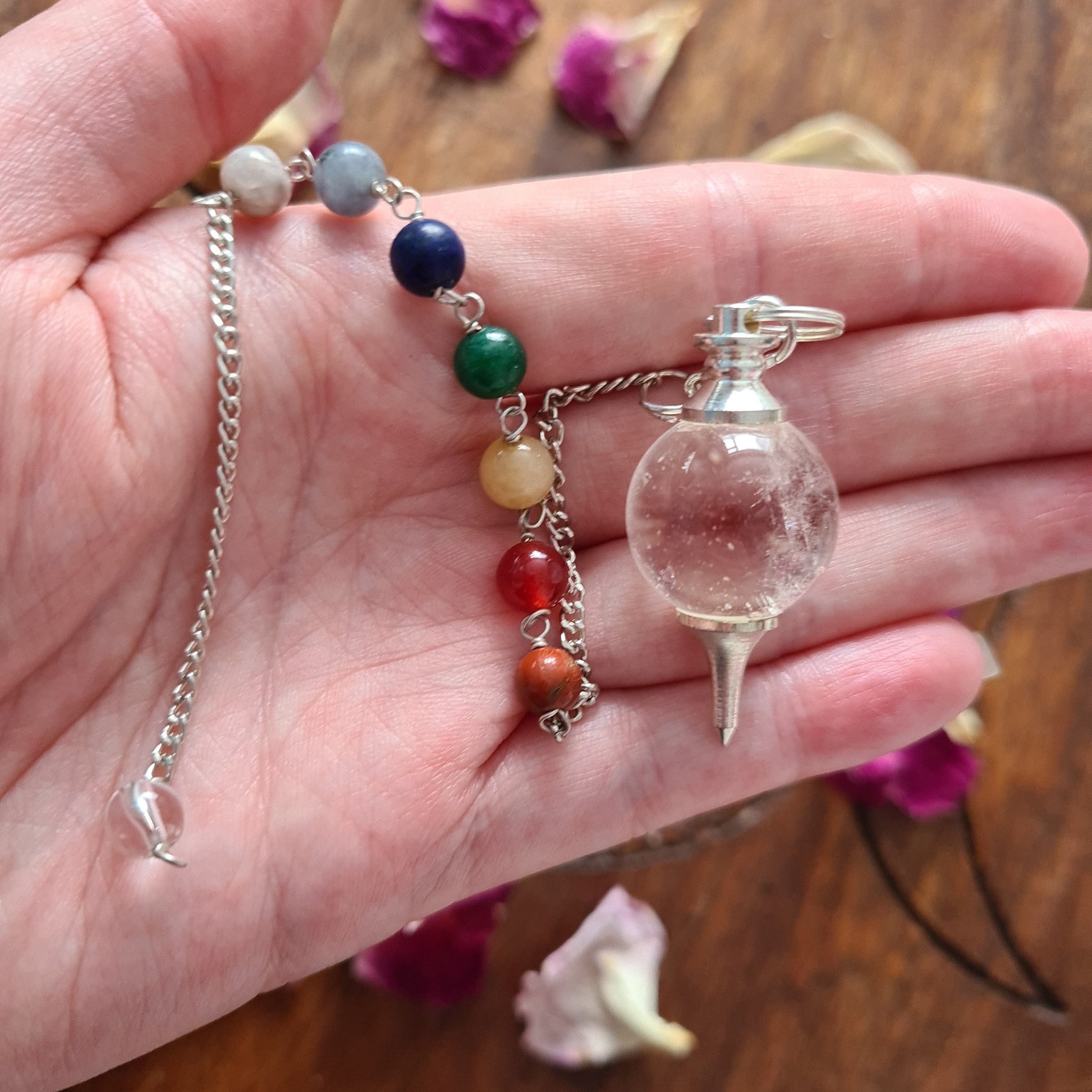This pendulum has a removable chain which can be worn as a bracelet. The chain has seven gemstone beads on it which relate to the chakra colours. The chain is fitted with a carabiner clasp.