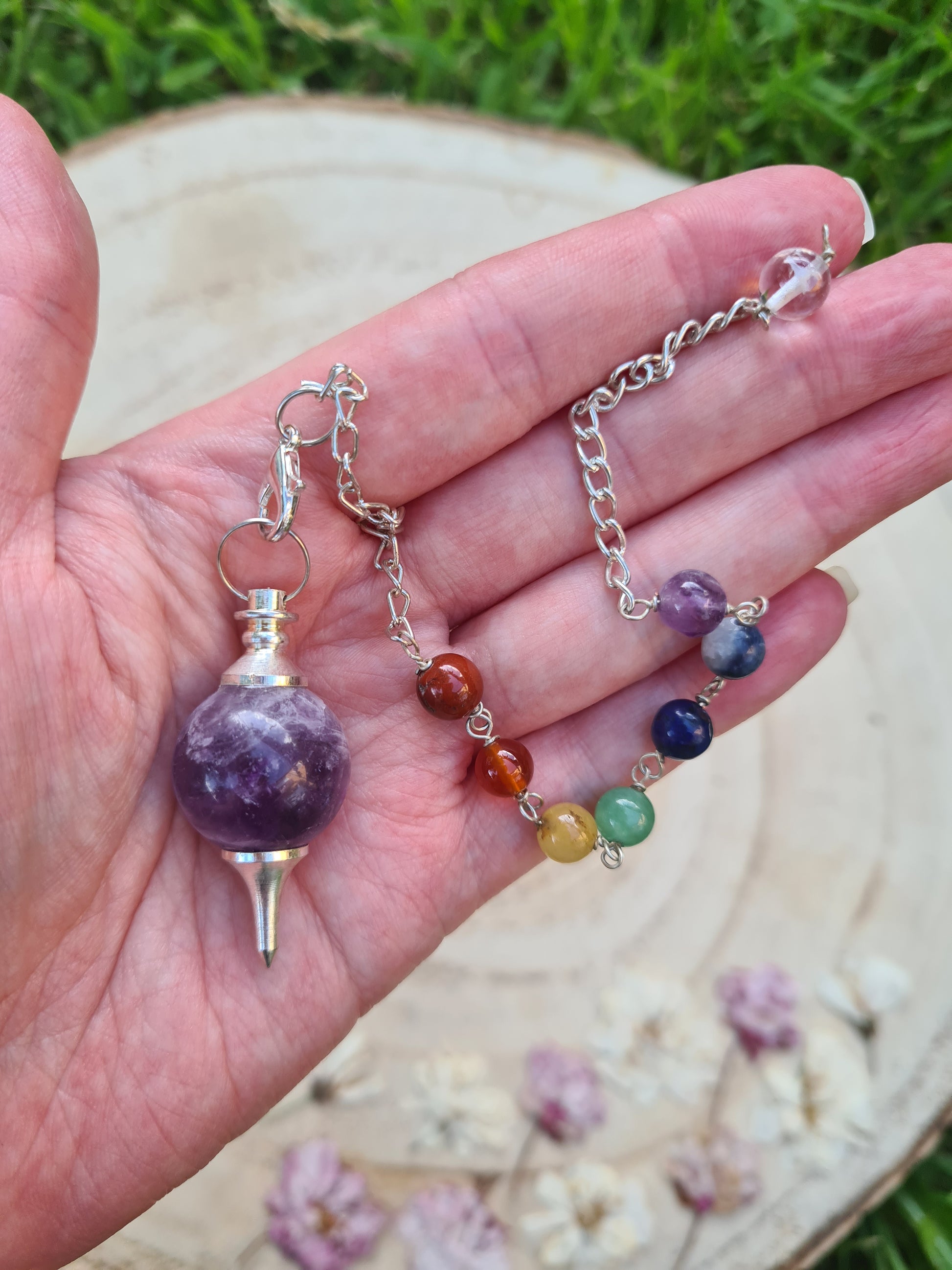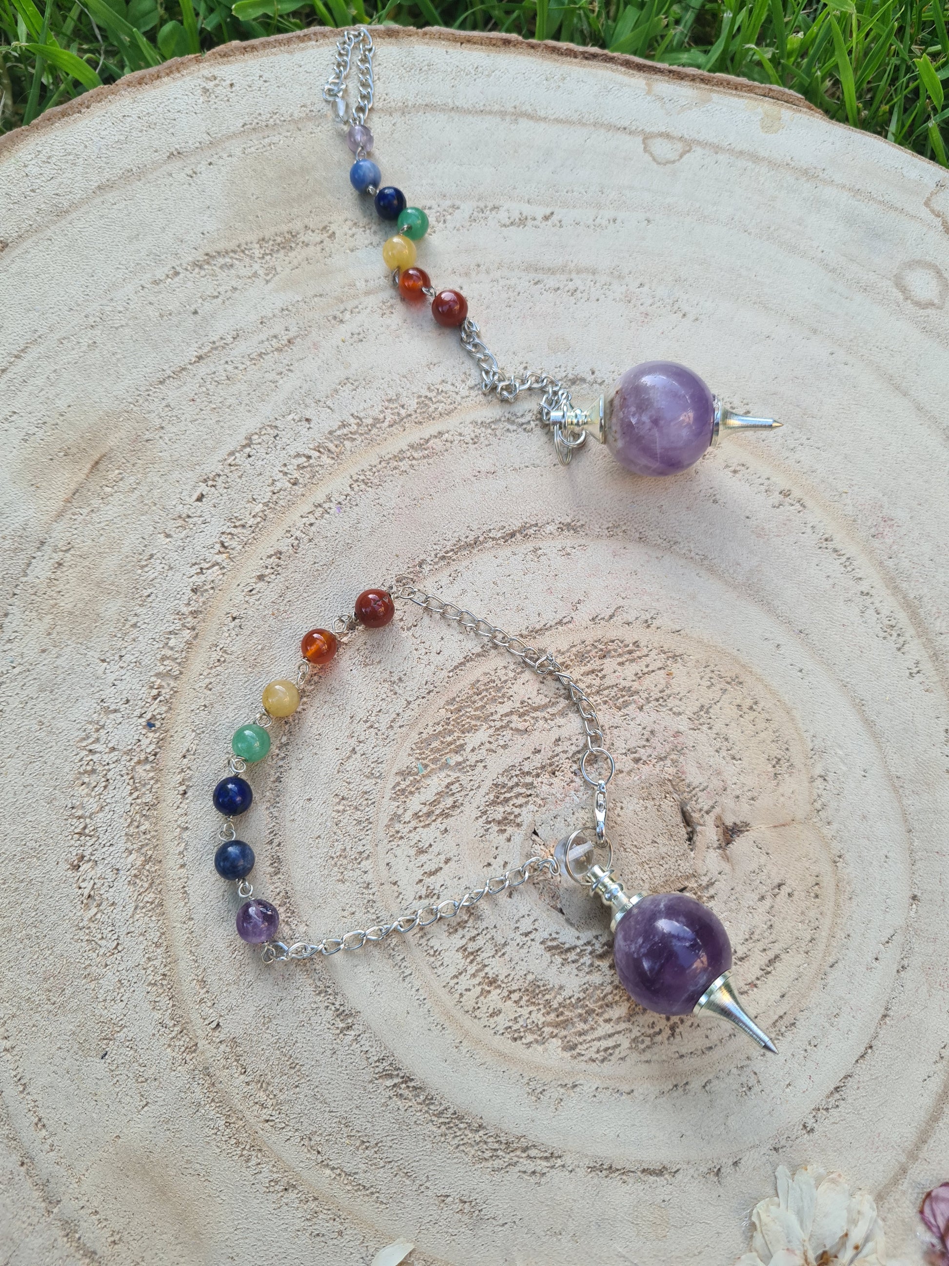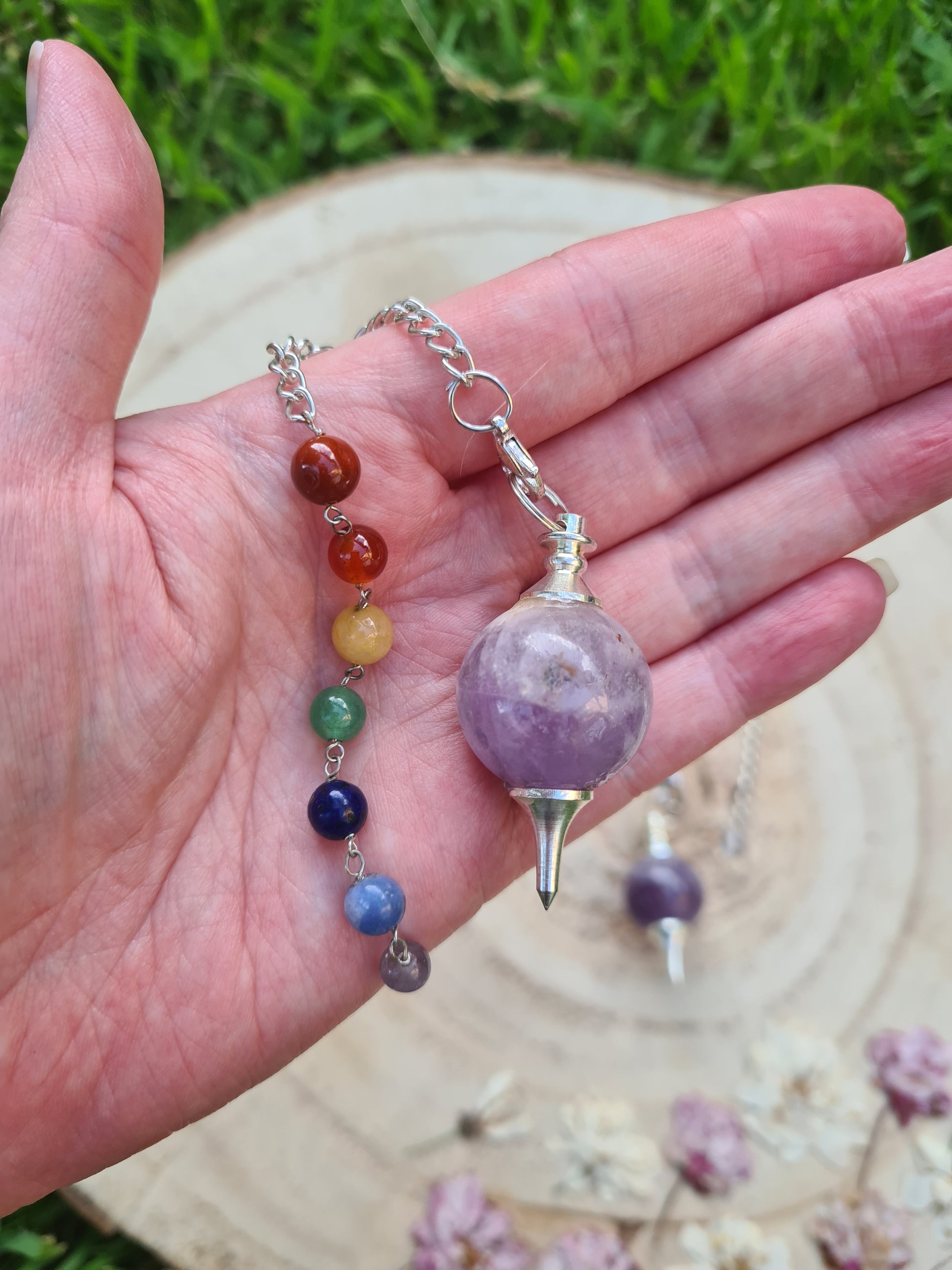 Amethyst or Clear Quartz Gemstone Sphere shaped pendulum on silver coloured chakra bead chain with clear quartz bead end.