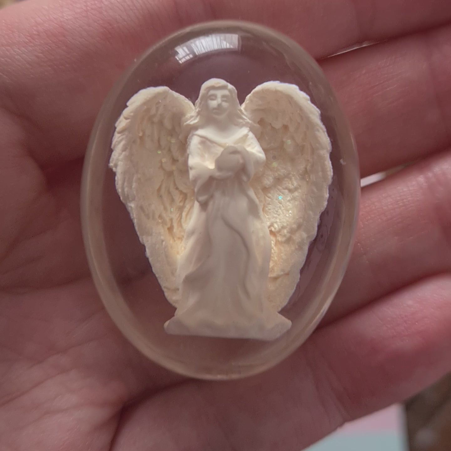This is a small angel contained in a protective see-through polymer resin, that makes these pocket “worry stones” very robust and suitable for carrying in your pocket or purse. The nature of the resin means they are not “cold” to the touch and they are pleasant to handle. A dusting of glitter on the wings inside means you can see reflections of light as you view the angel from different angles. To hold they feel substantial, yet lightweight. The variation in the worry stones in this range is the design of the angel inside the stone.