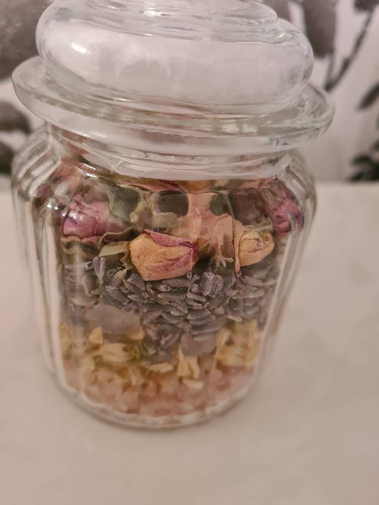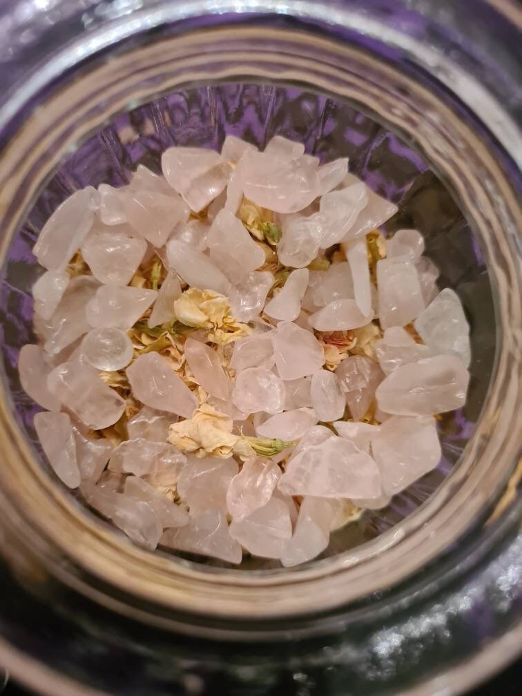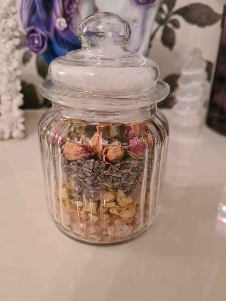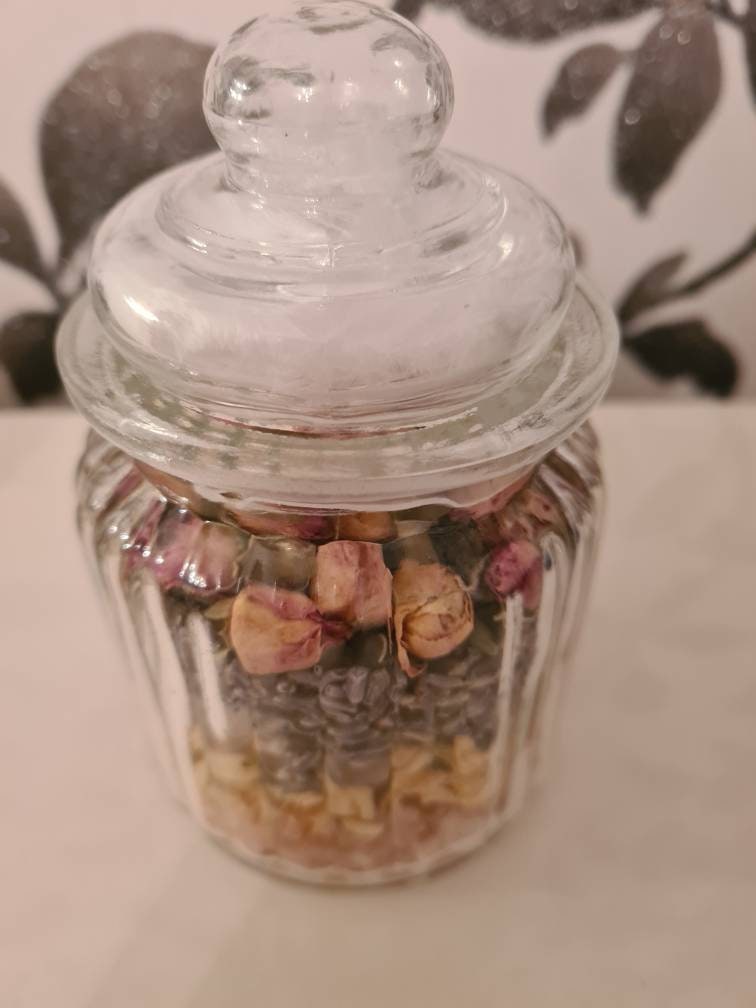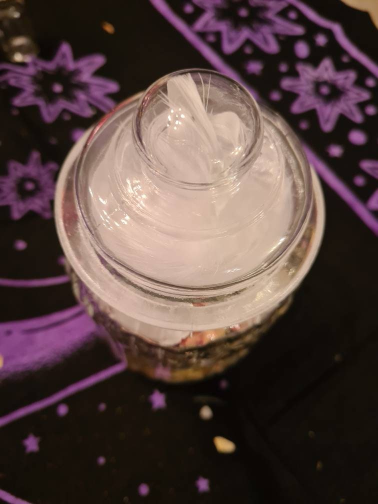 This beautiful jar crammed full with himalayan salt, organic flowers and rose quartz crystals. The jar is topped with artificial white feathers to connect with the angels to bring self love into your life. This item would look beautiful on your altar, dressing table, bedroom or a bathroom (as long as the bathroom does not create to much steam). Call upon Venus energy to bring loving energy into your life.