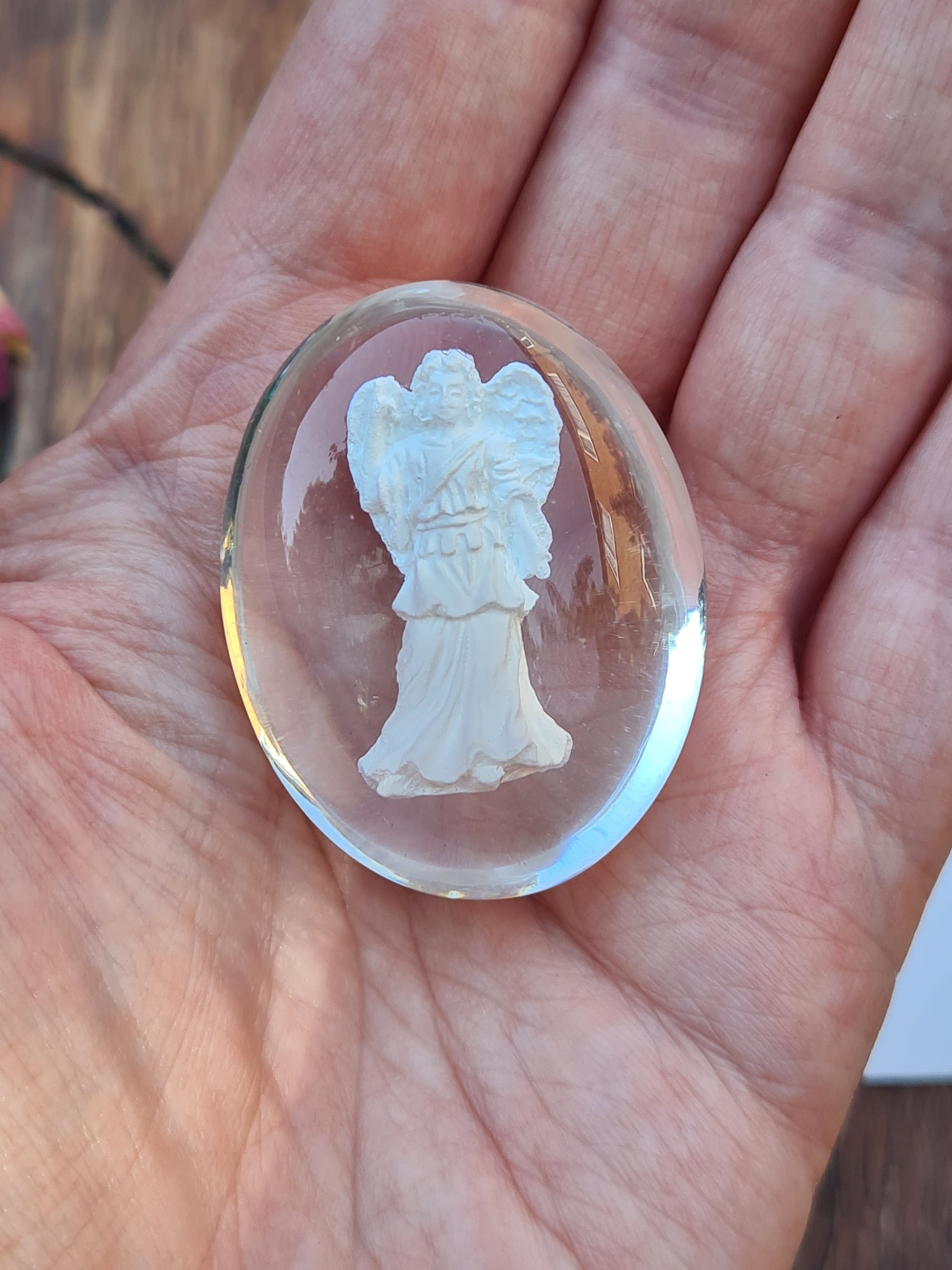 This is a small angel contained in a protective see-through polymer resin, that makes these pocket “worry stones” very robust and suitable for carrying in your pocket or purse. The nature of the resin means they are not “cold” to the touch and they are pleasant to handle. A dusting of glitter on the wings inside means you can see reflections of light as you view the angel from different angles. To hold they feel substantial, yet lightweight. The variation in the worry stones in this range is the design of the angel inside the stone.