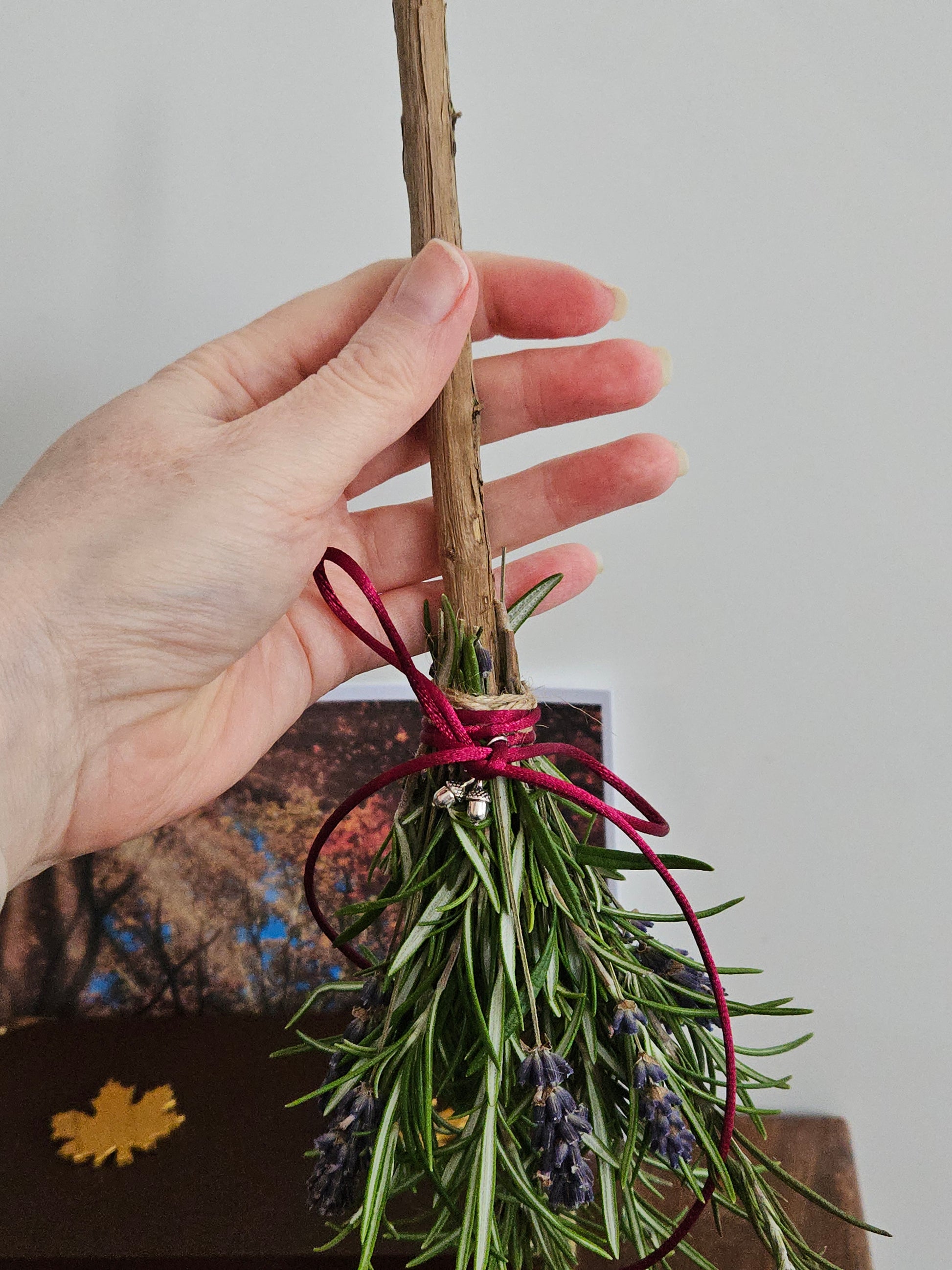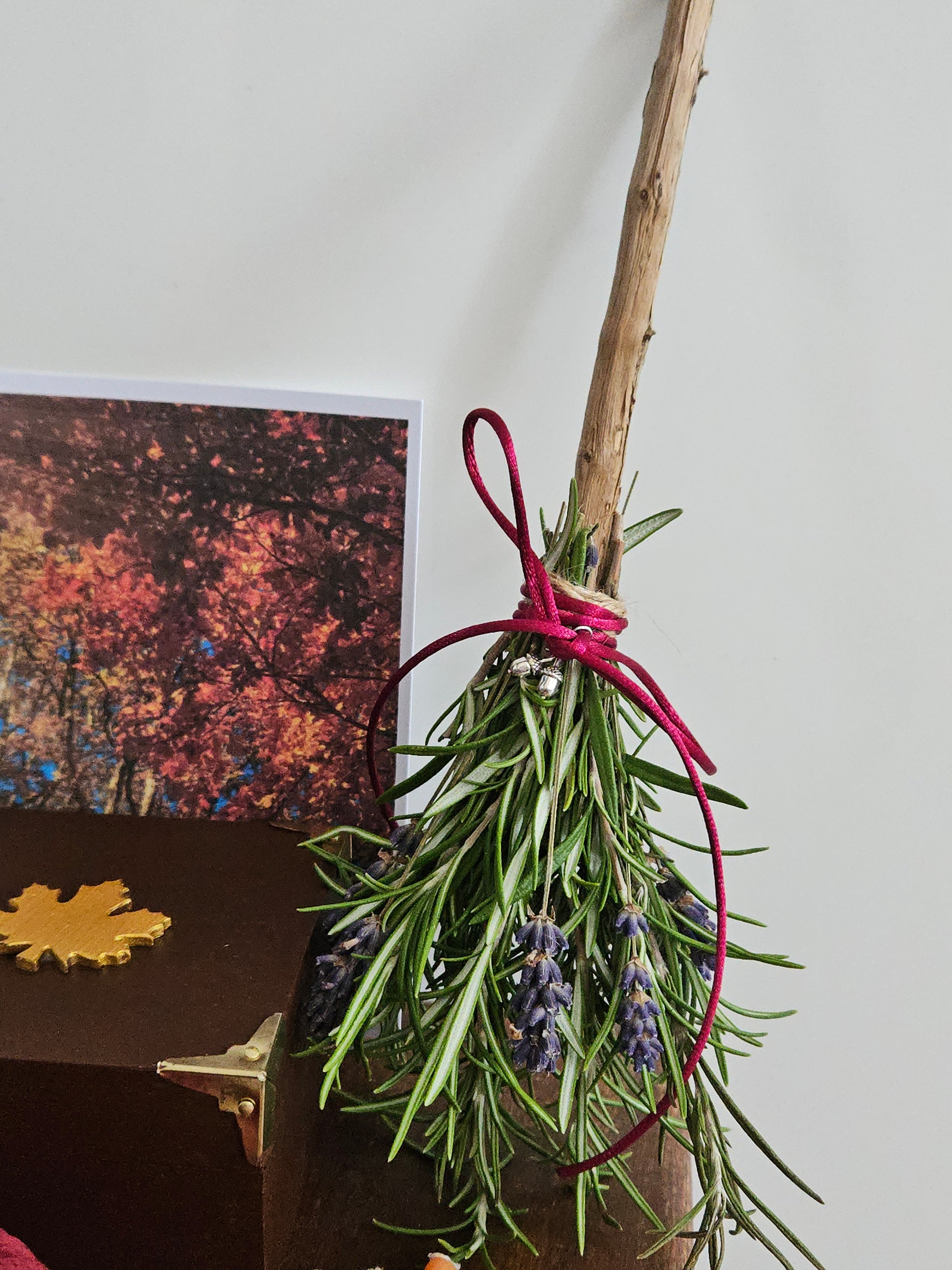 1x Rosemary and Lavender handmade besom broom decorated with burgundy ribbon and an acorn charm