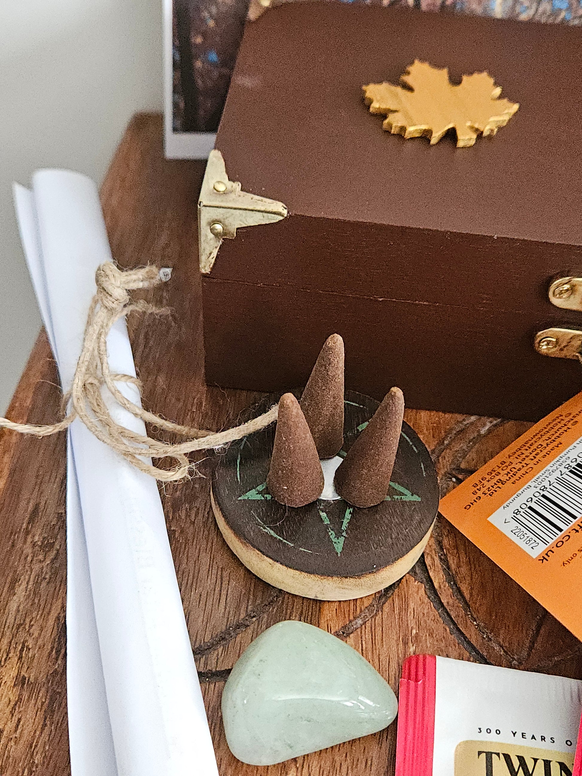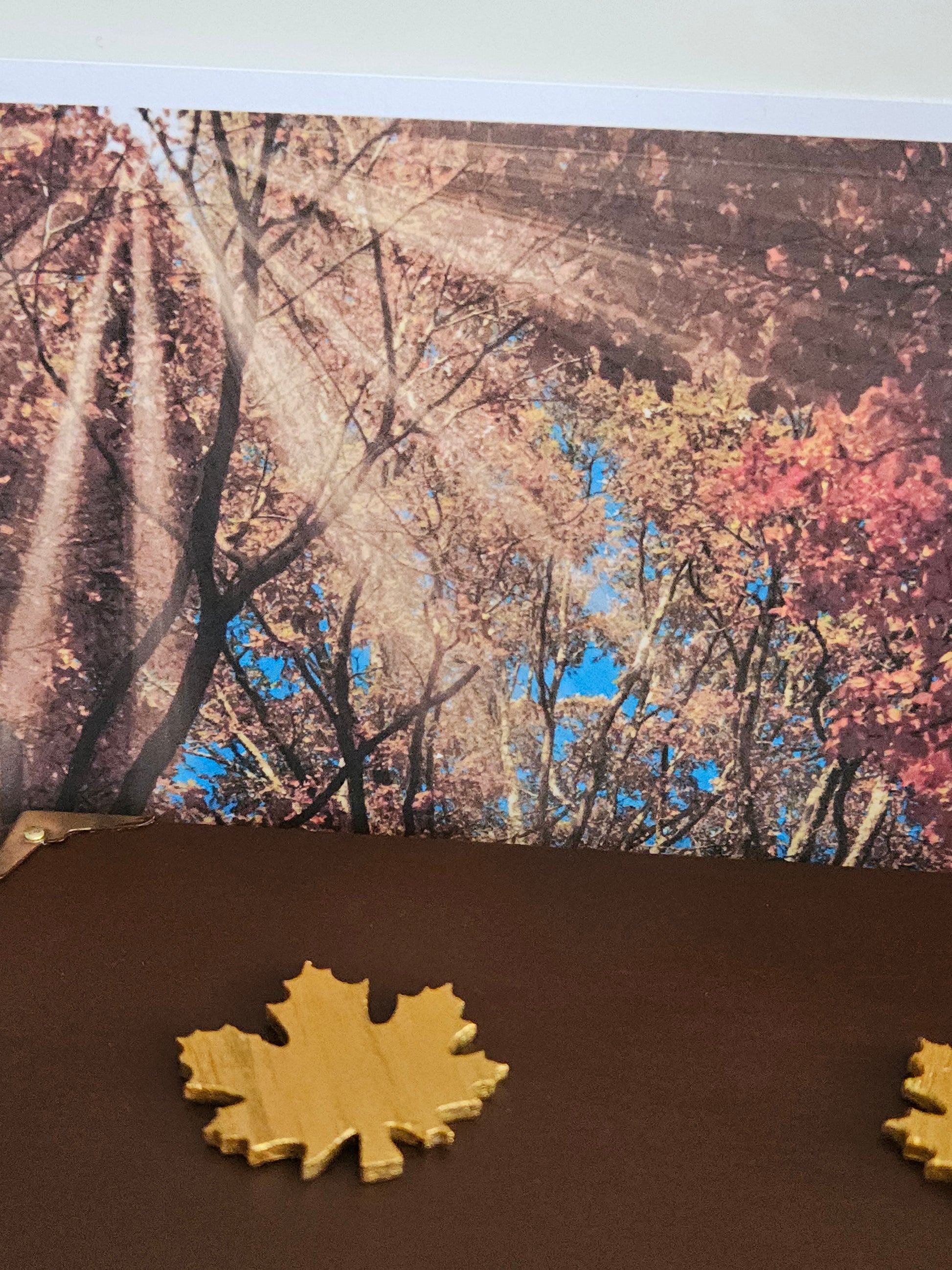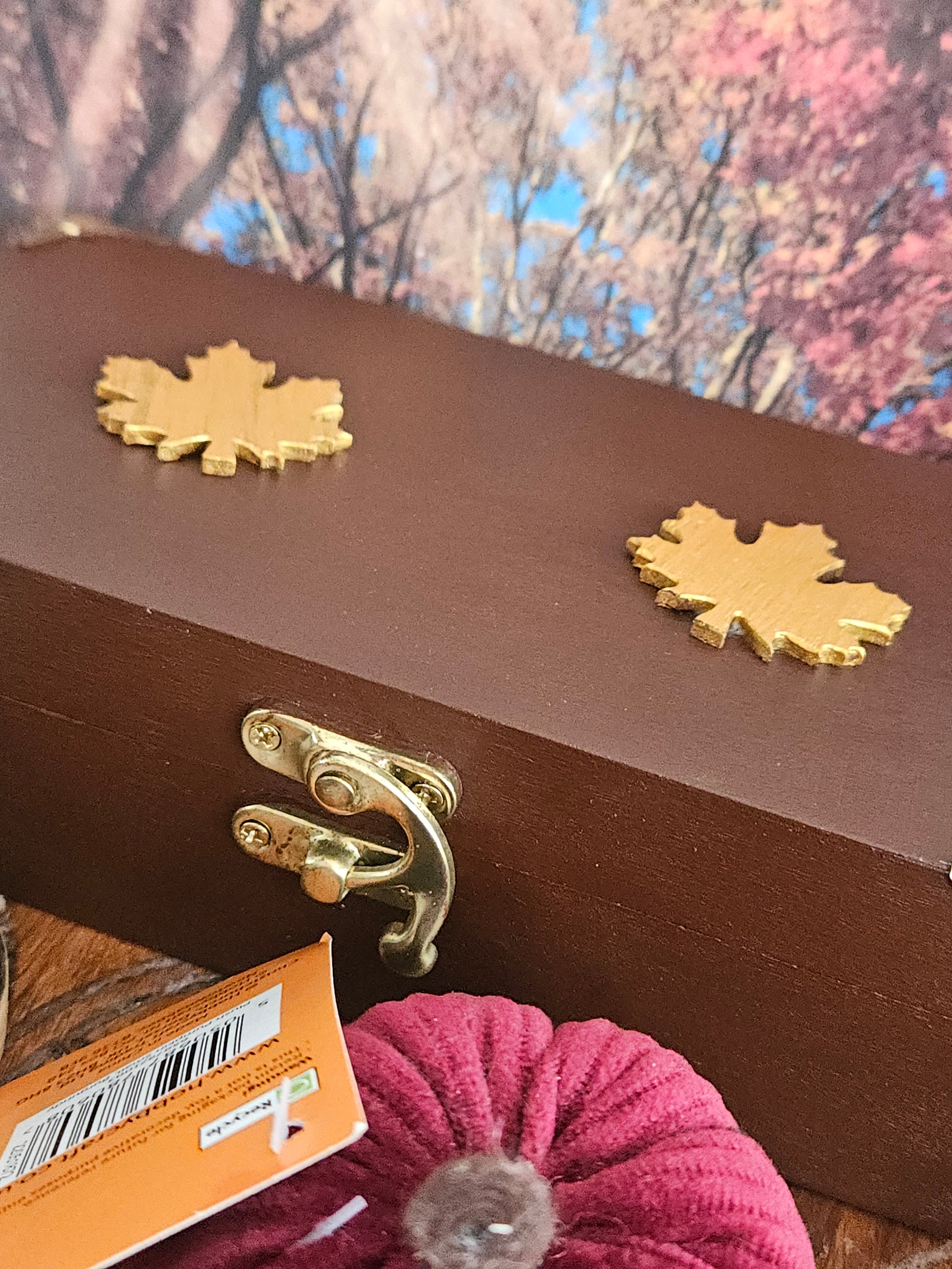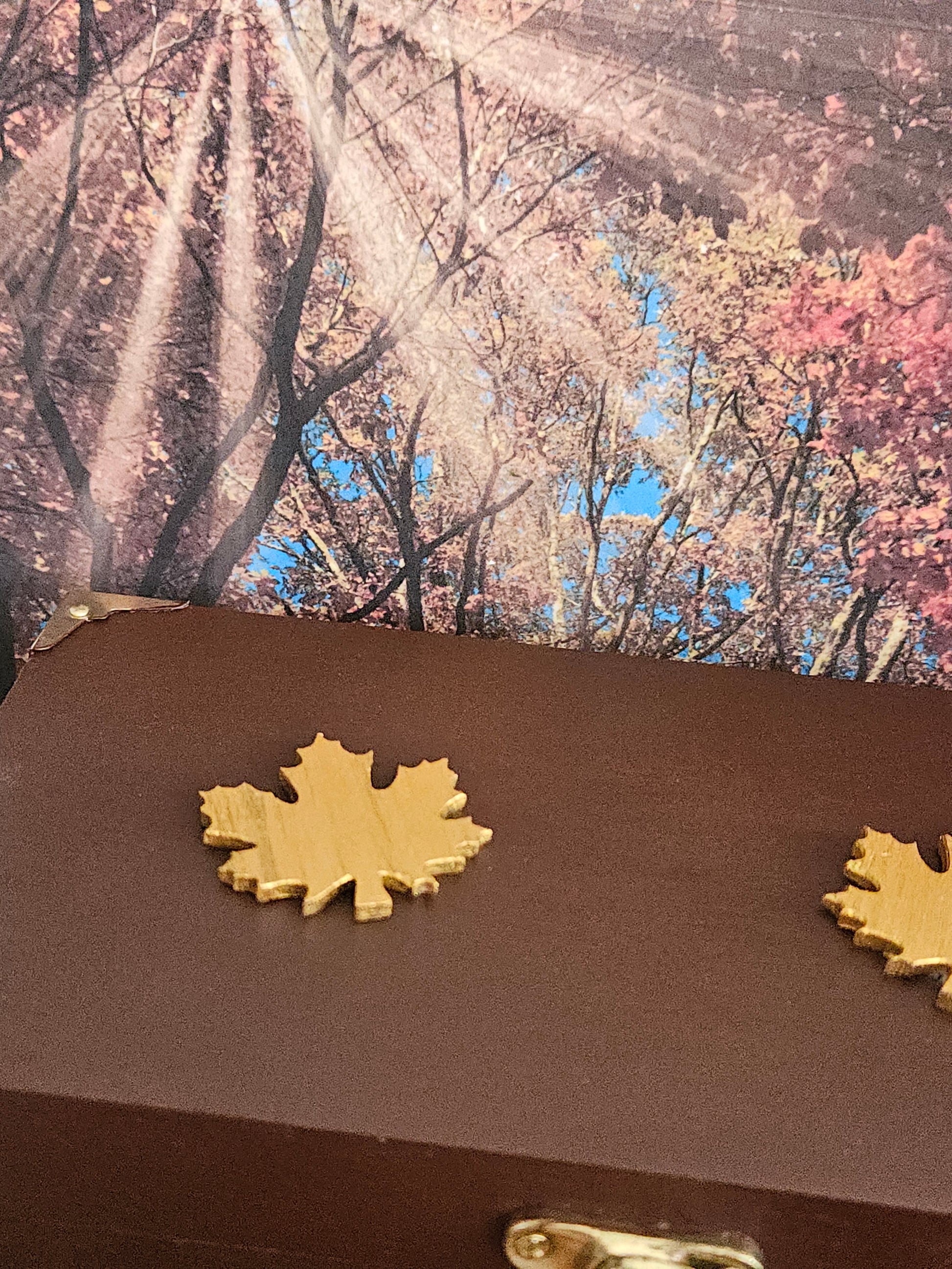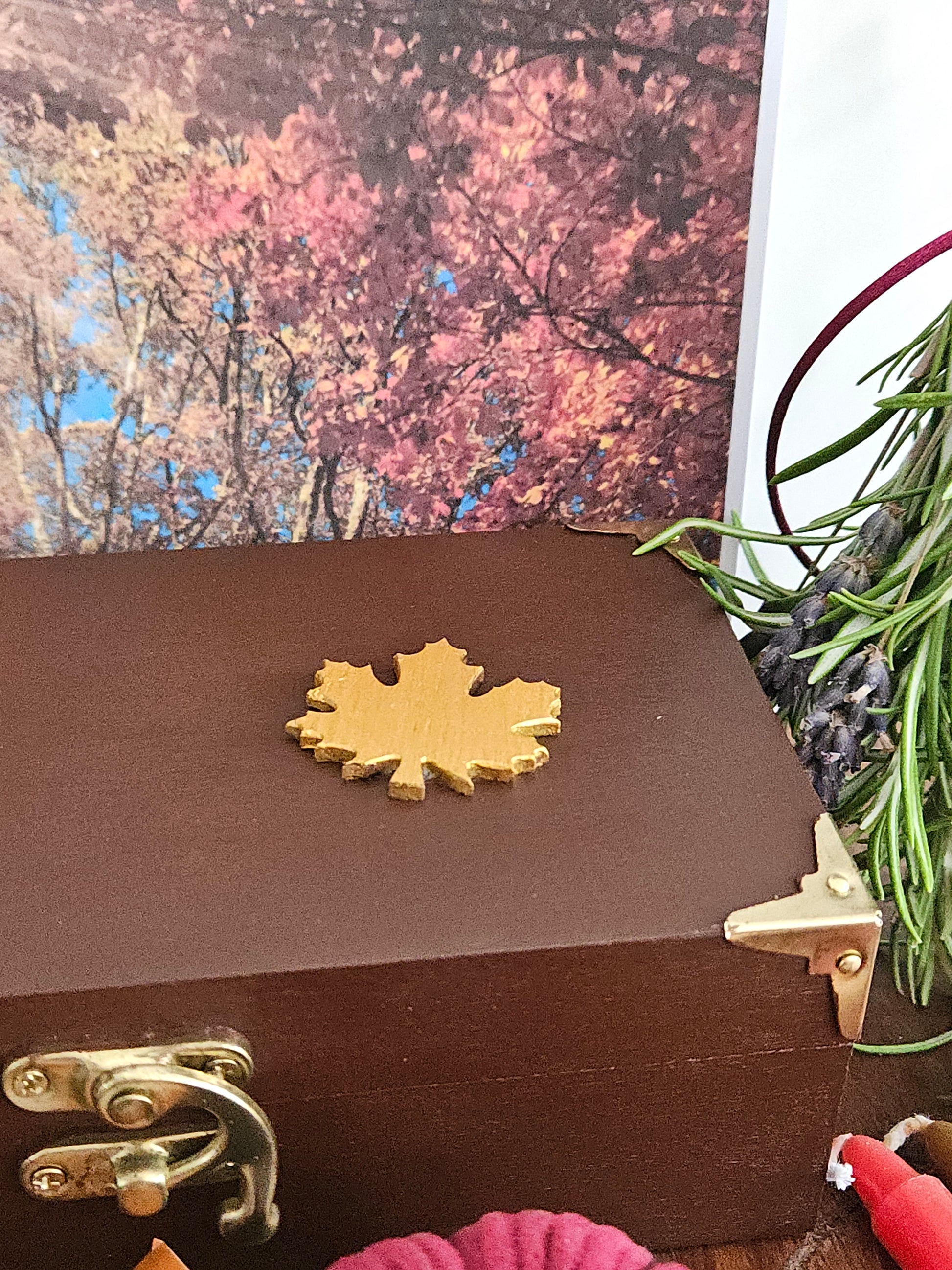 1 Altar box decorated handpainted in Burnt umber, the lid is then decorated with wooden maple leaves finished in gold paint - Measures: 9.5 x 17.5 x 5.5cm