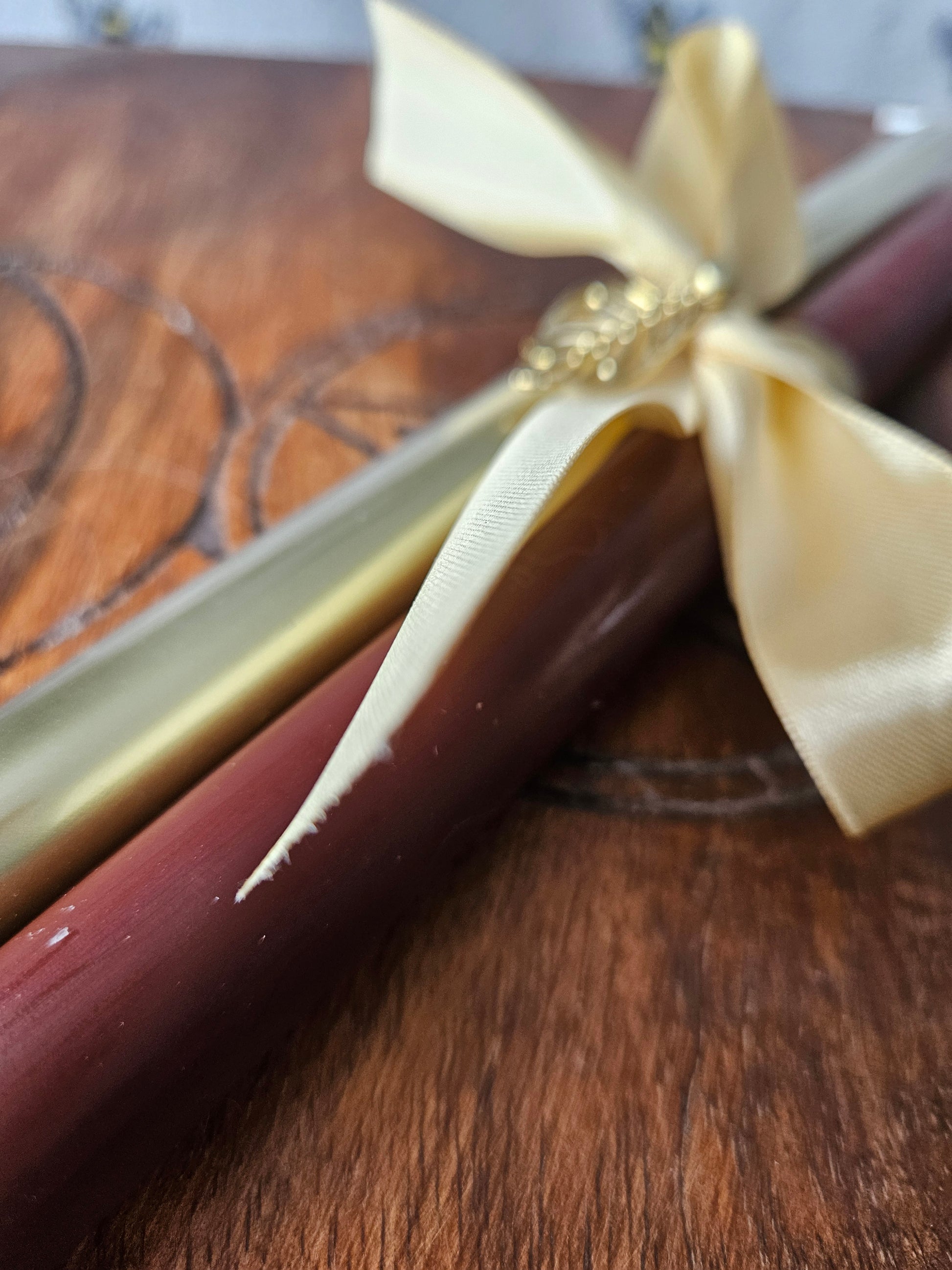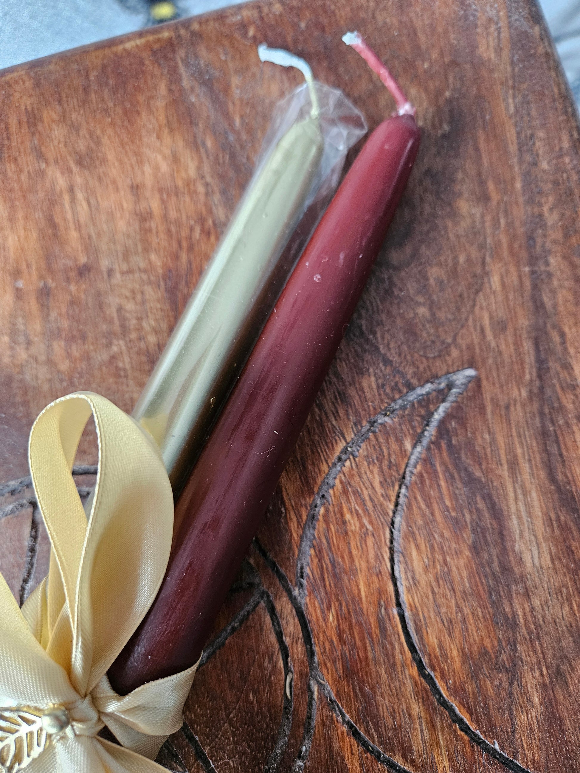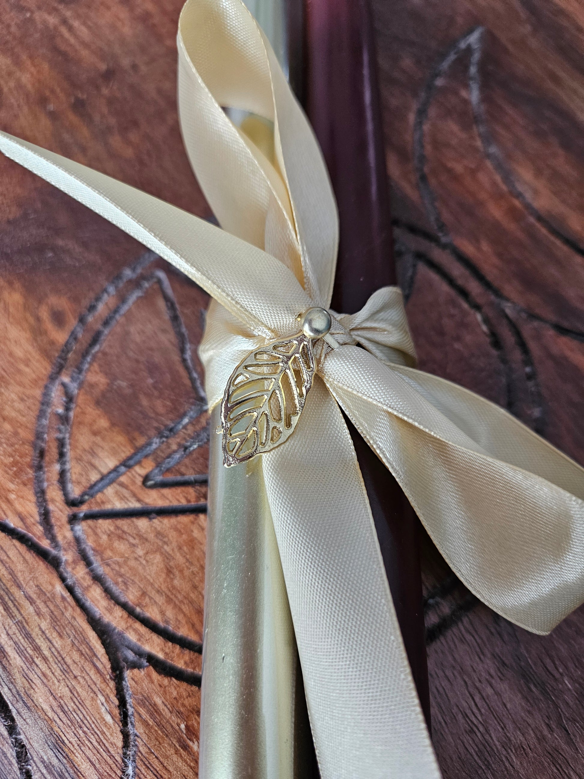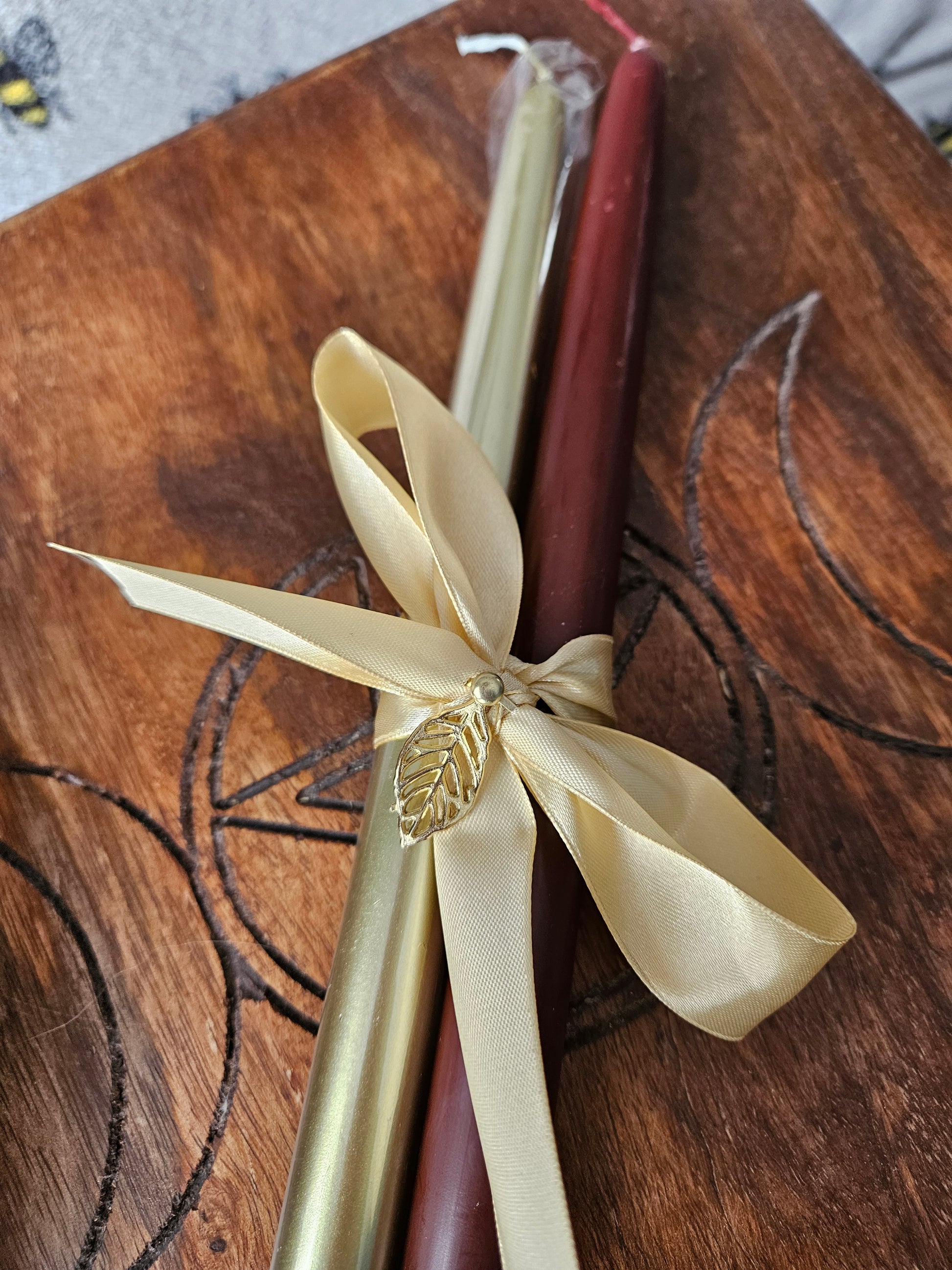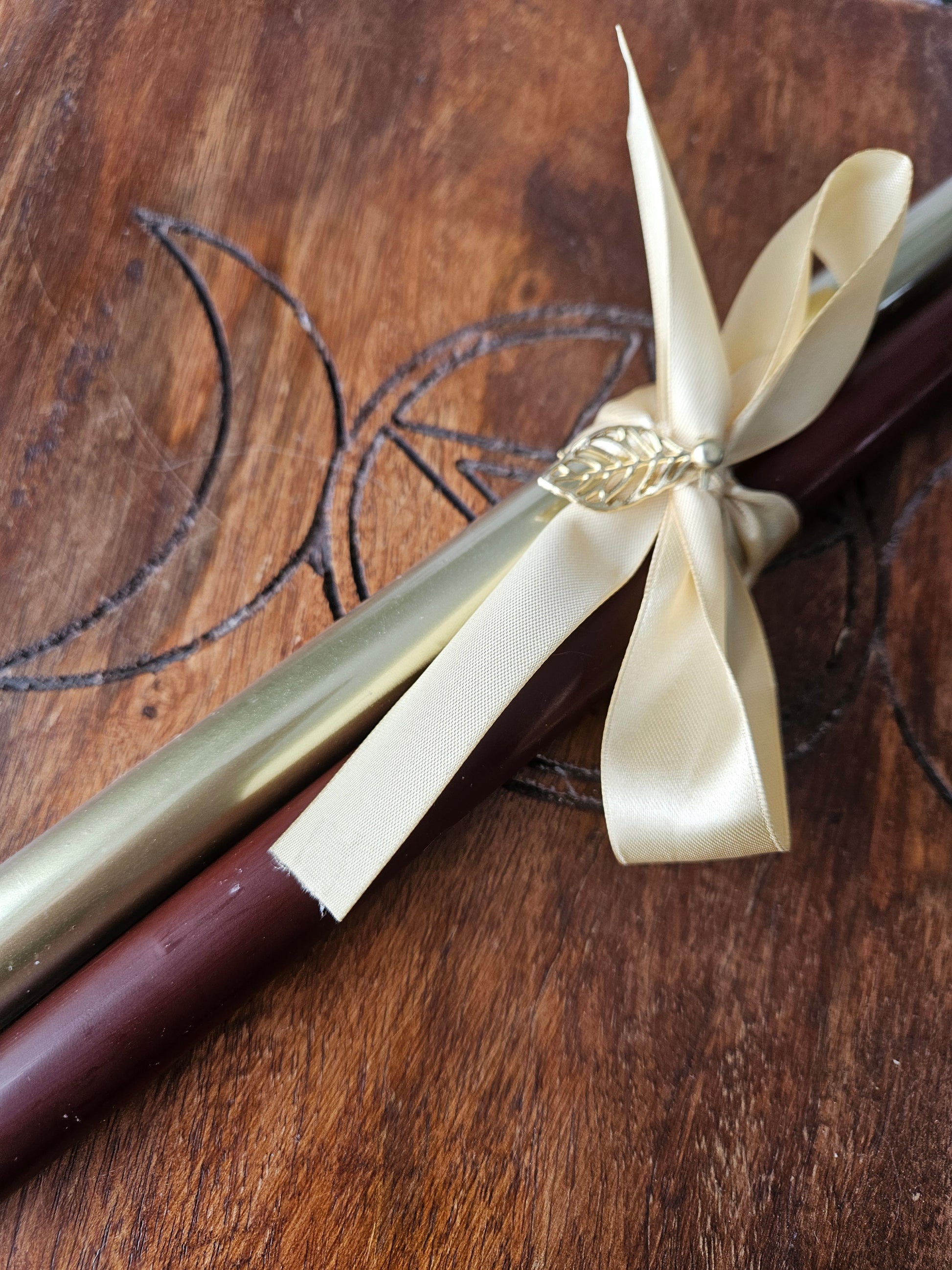 Celebrate autumn season with a set of these beautiful large tapered candles. You will receive 1 brown and 1 gold candle and are perfect for around the home or altar. The candles are tied with gold ribbon and a gold leaf embellishment.