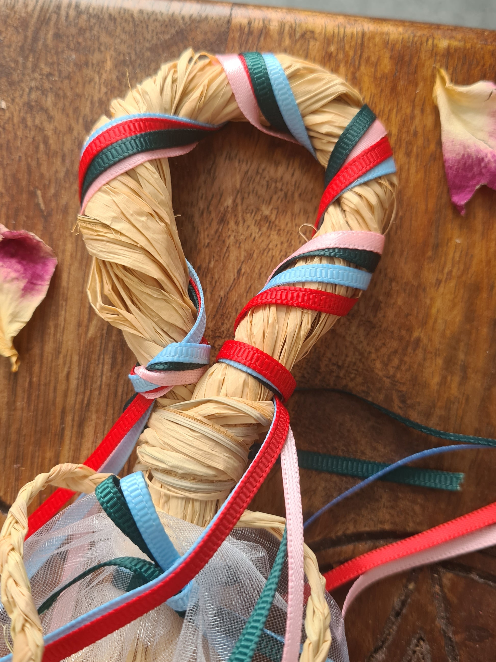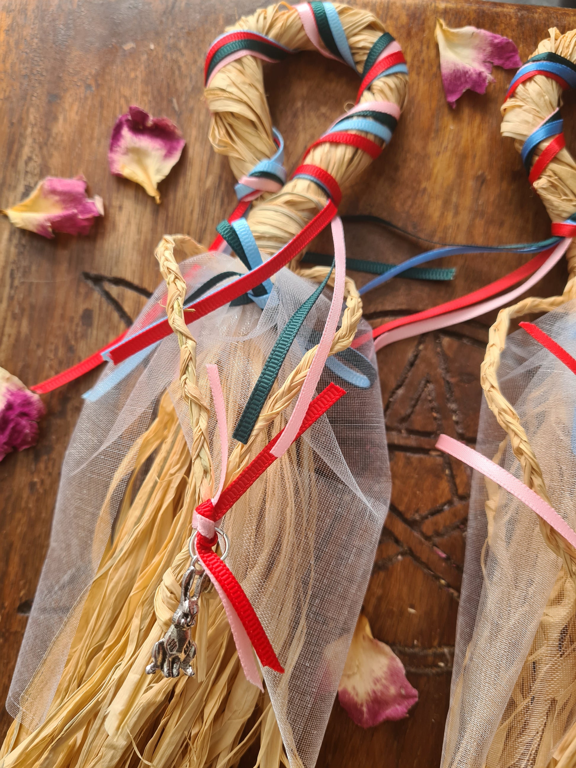 Made from Raffia and adorned with your choice of either a hare or fairy on the moon charm to represent the season. She has an organza skirt and to attach the charm to her hand and skirt are rubbons. Finally she has a multiple coloured ribbon headress to represent the colours of Beltane and the May pole - green, blue, pink and red.