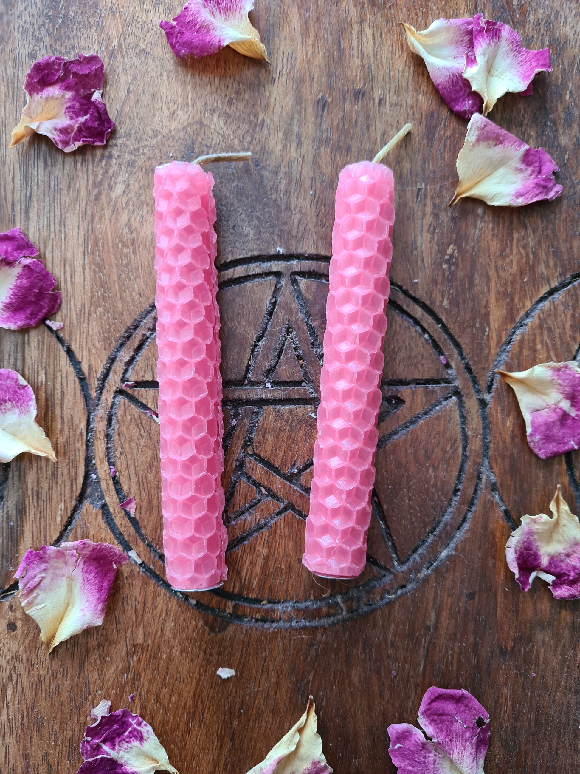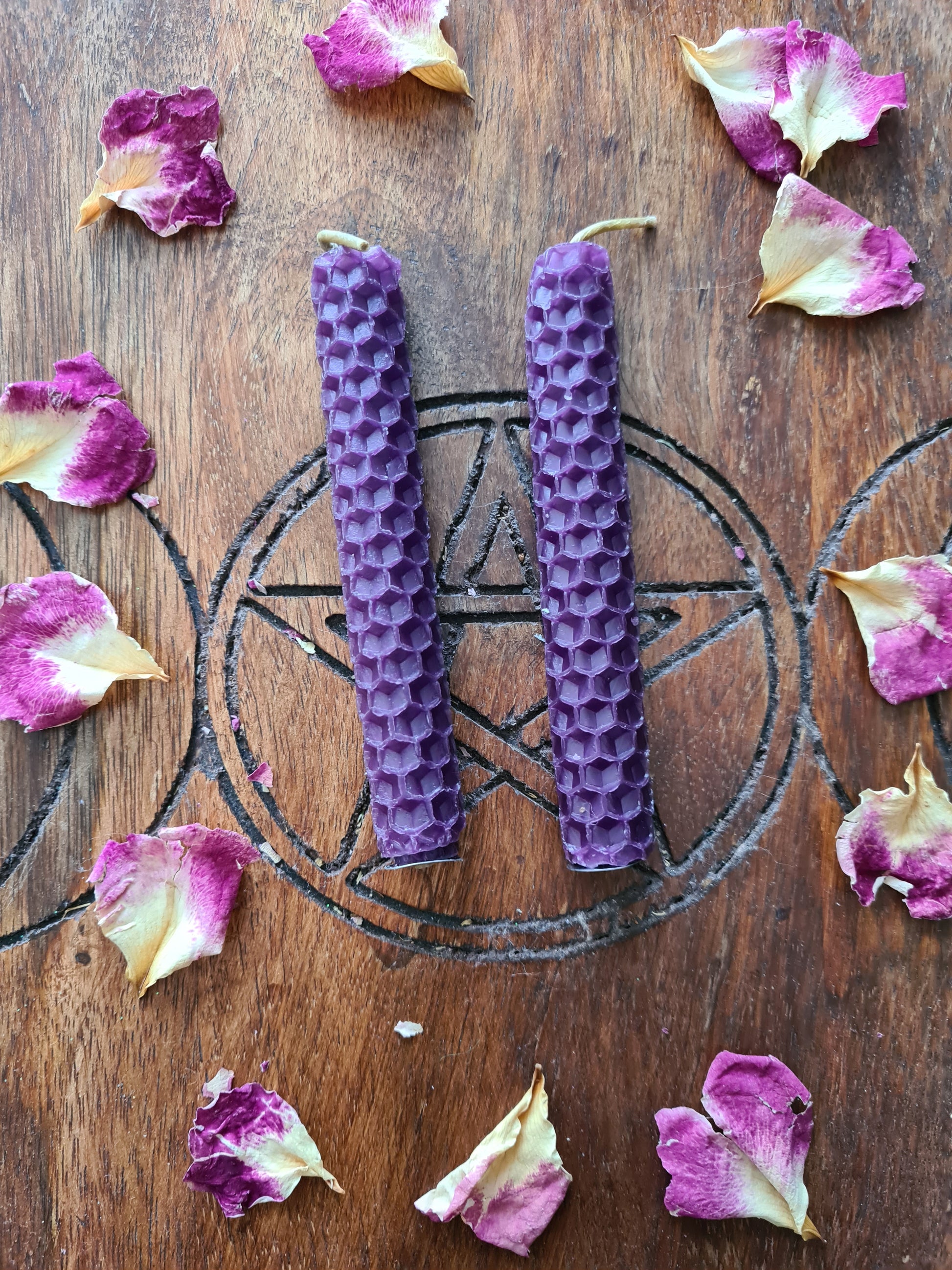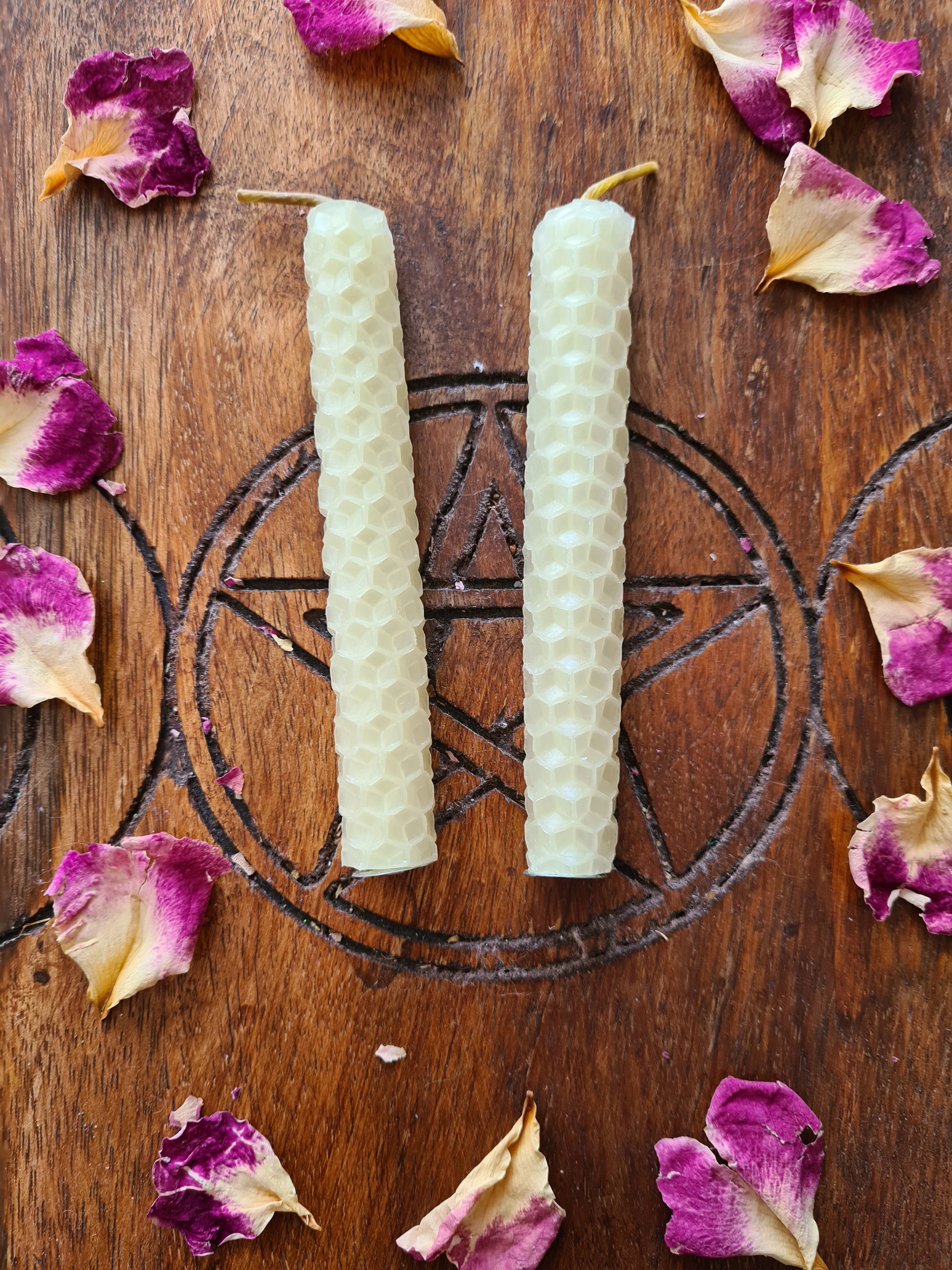These beautiful Blessed Bee beeswax candles are perfect for spellwork. Light, natural scent. Approximate burn time of 1 hour. 100% linen wick. Non-toxic. Do not ingest. Due to the hand rolling process, candle diameter will vary and may not fit all holder types. Colour may vary slightly between production batches. Measure approx 10cmx1.5cm
