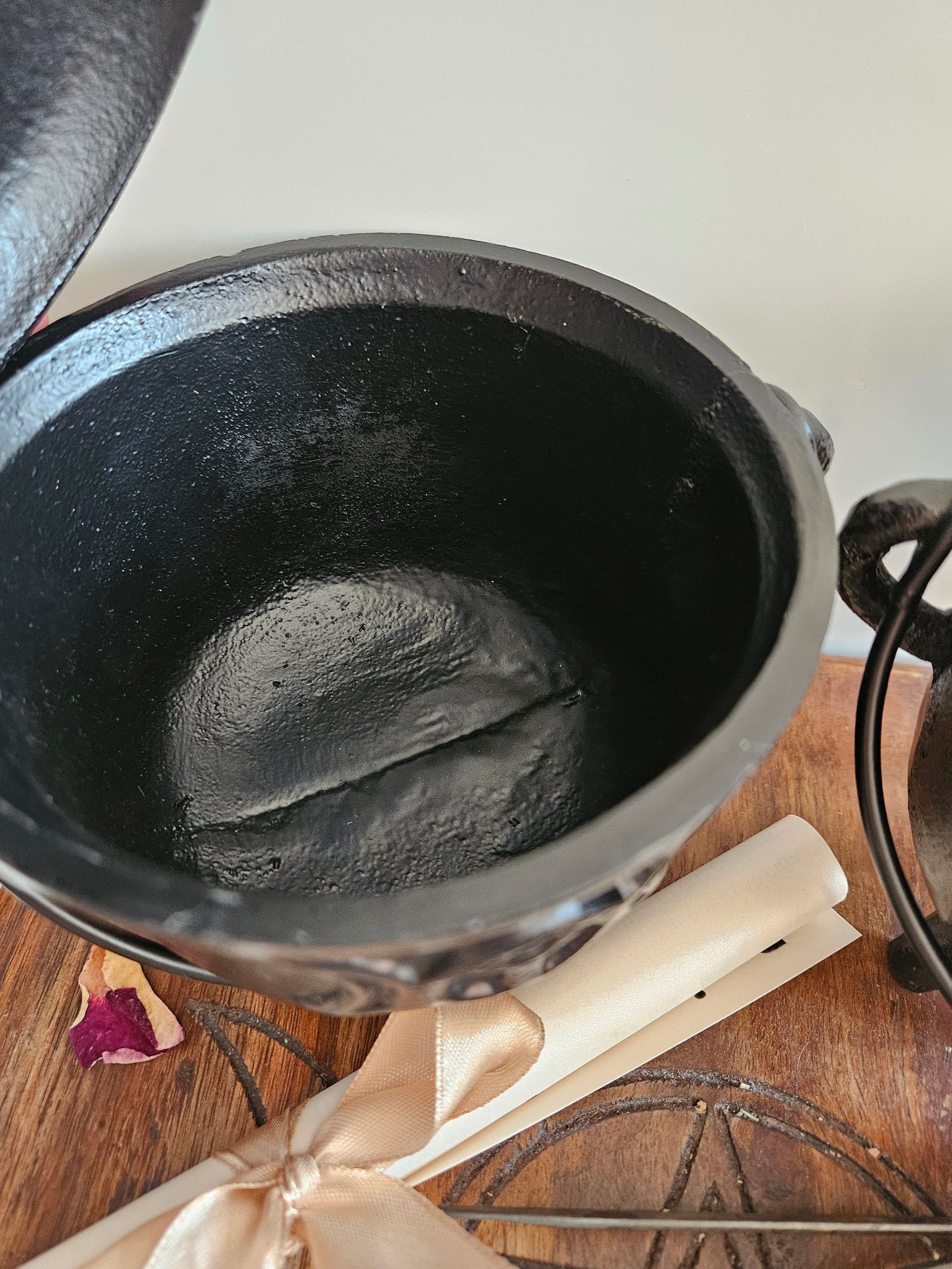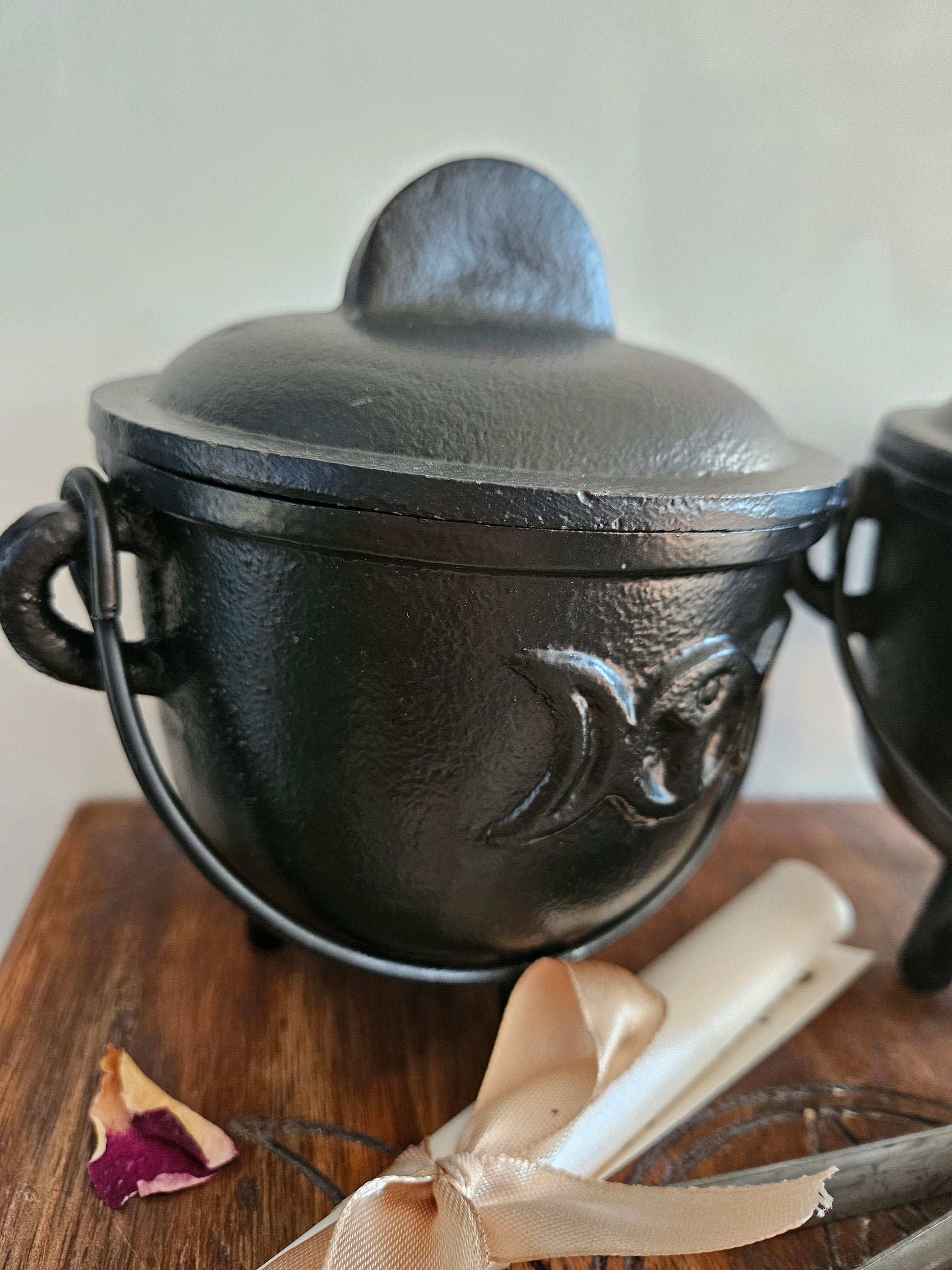 1 Cast iron Cauldron featuring a Pentagram or Triple Moon. A medium sized cast iron cauldron with triple moon design in a smooth finish. Add to an altar space for use during rituals and spell work. Also perfect for making moon water, scrying, combining herbs and more. Measures 11cm tall, not including handle. Not suitable for use with tall candles or food items. Caution: cauldron will get hot when used with a heat source. Please handle with care and always place on a heat resistant surface. H15.5cm X W15.3cm X D12cm