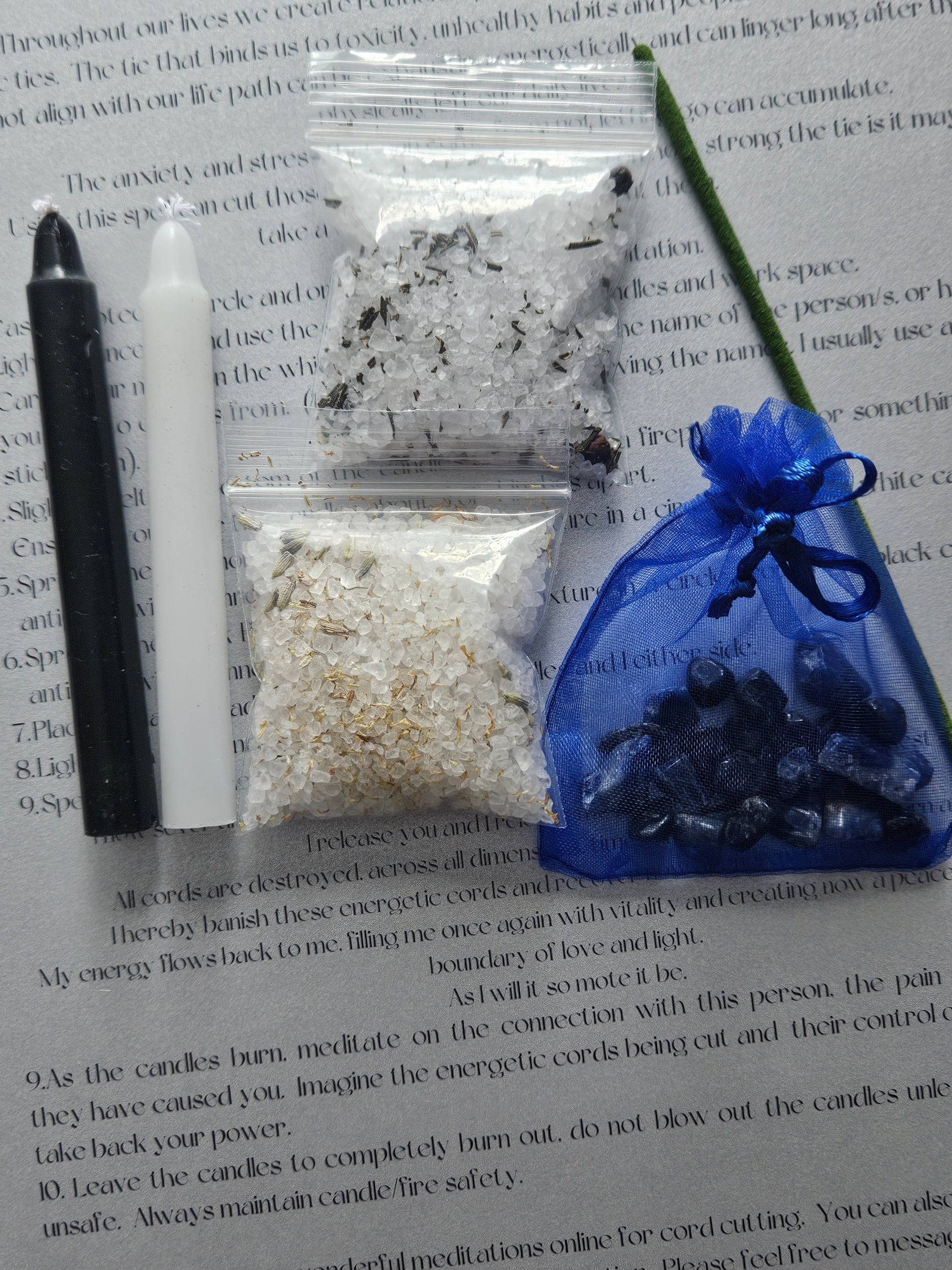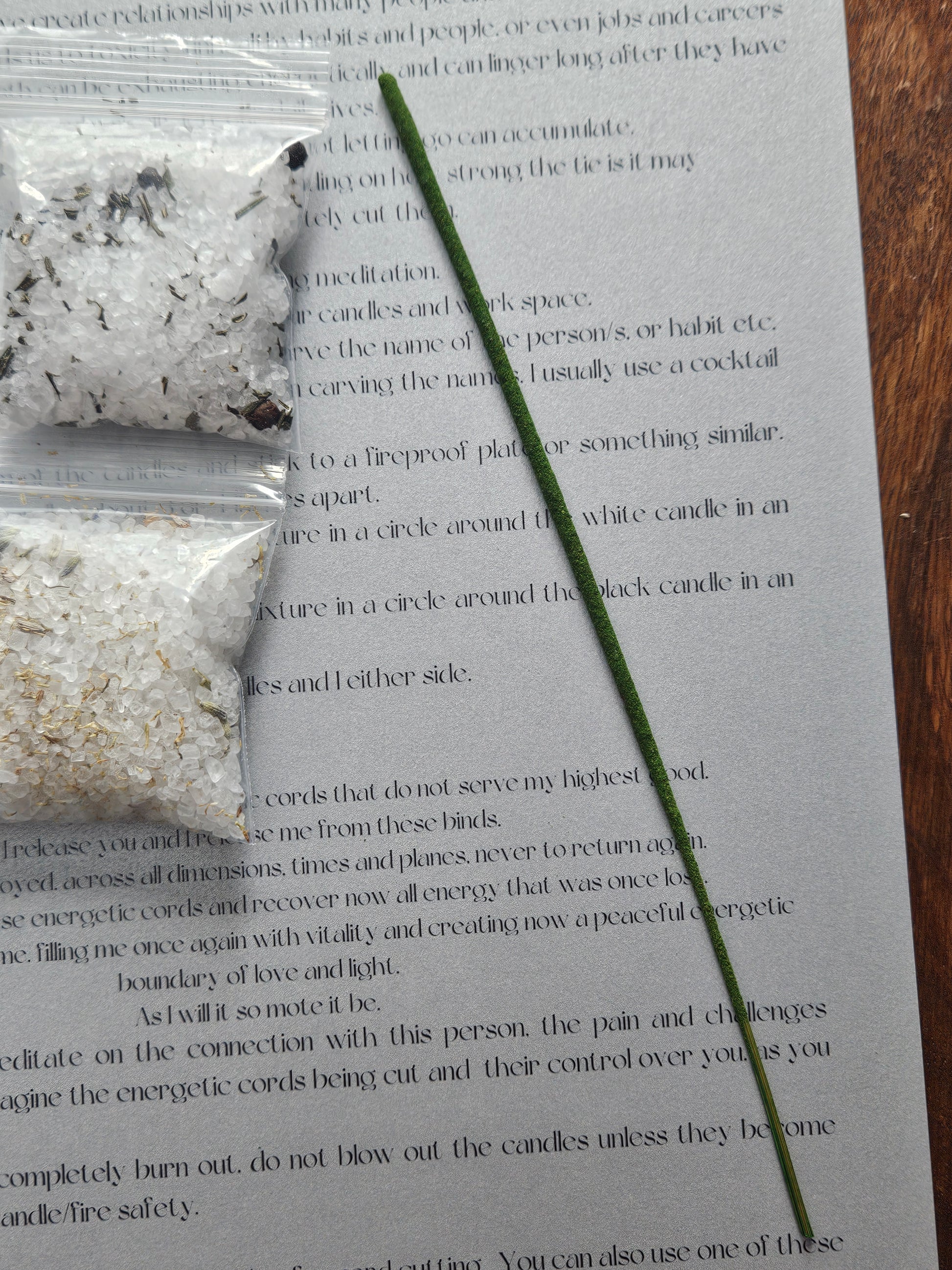 A cord-cutting ritual is a spiritual practice, rooted in various traditions, used to sever perceived negative emotional or energetic ties to people, places, objects, or beliefs that are no longer serving one's well-being.