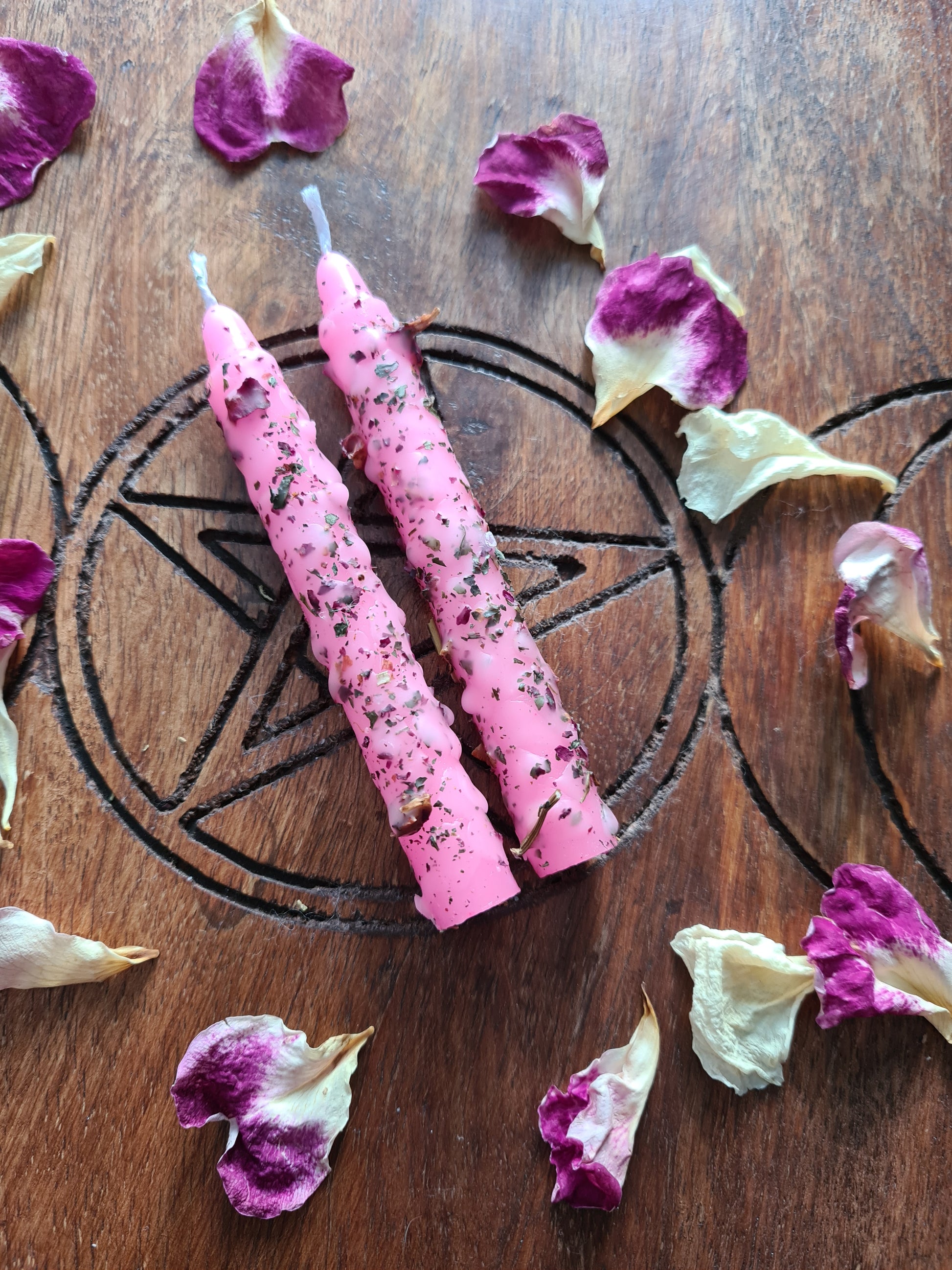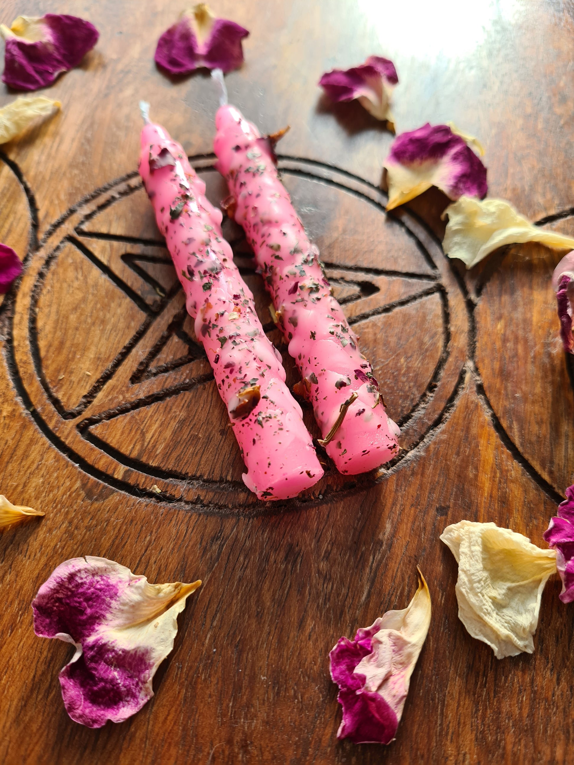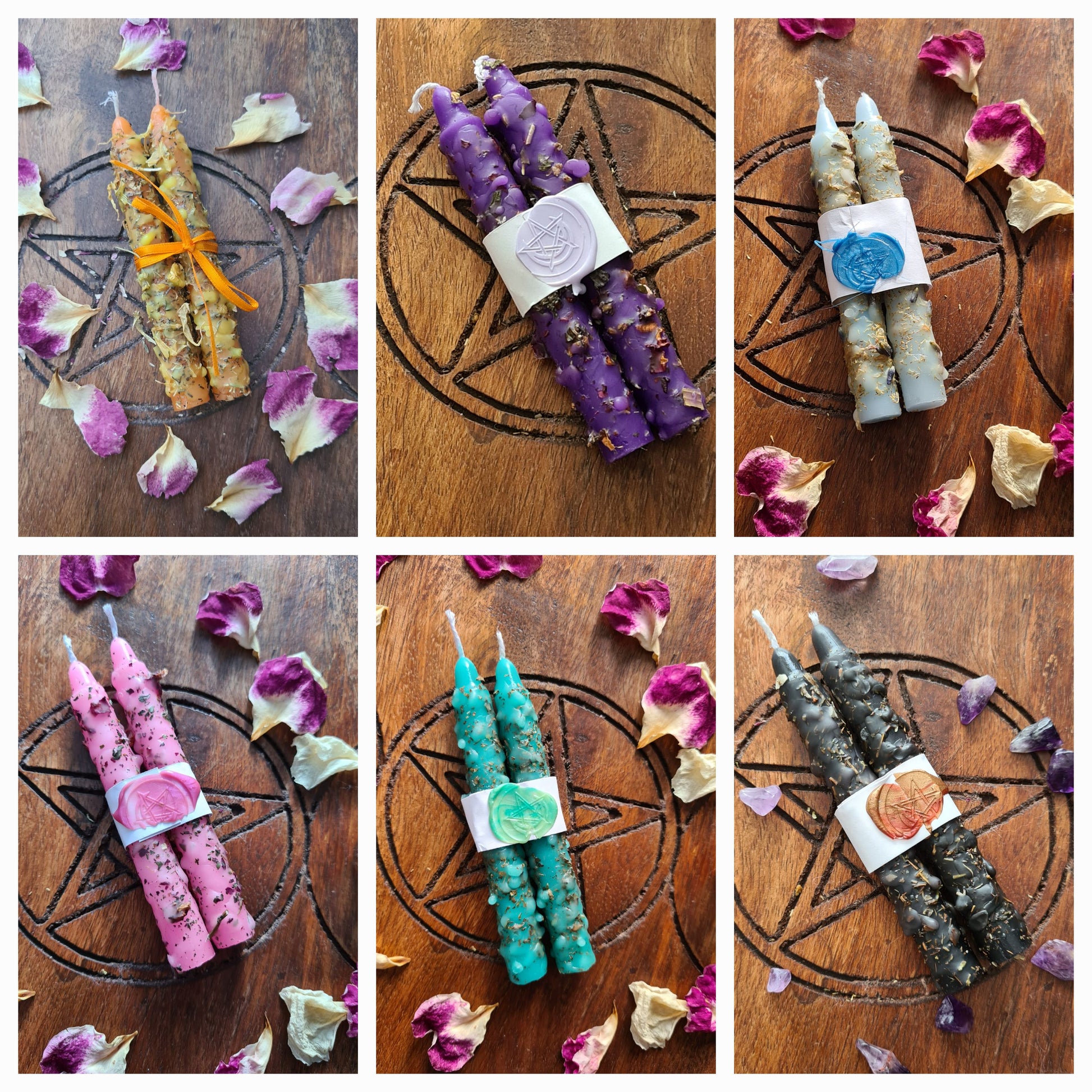 The candles have been annointed with an essential oil corresponding to the candle and then dressed with herbs or flowers to help your spell. The candle is then finally dripped with the same colour wax to seal in the herbs/flowers.