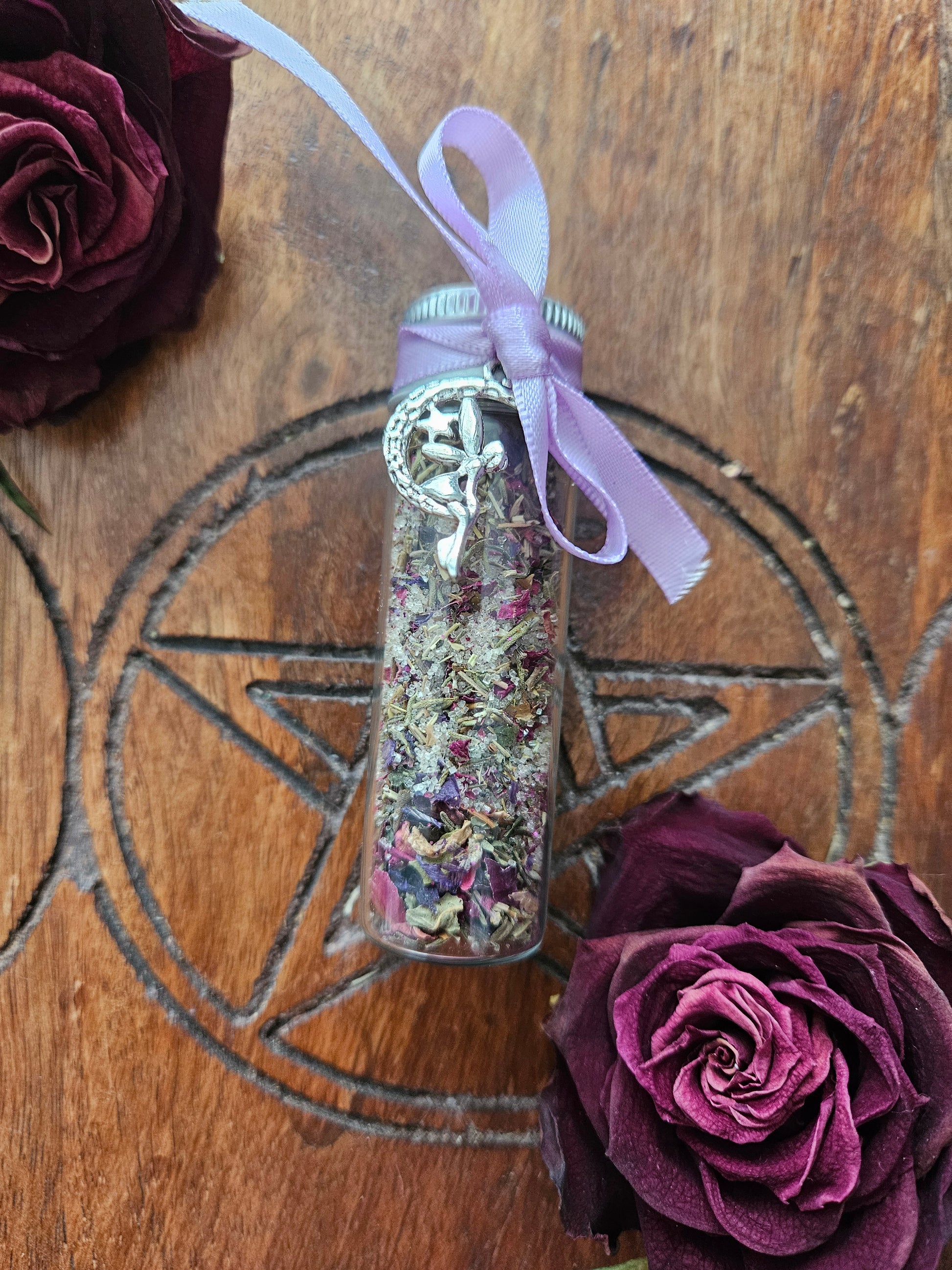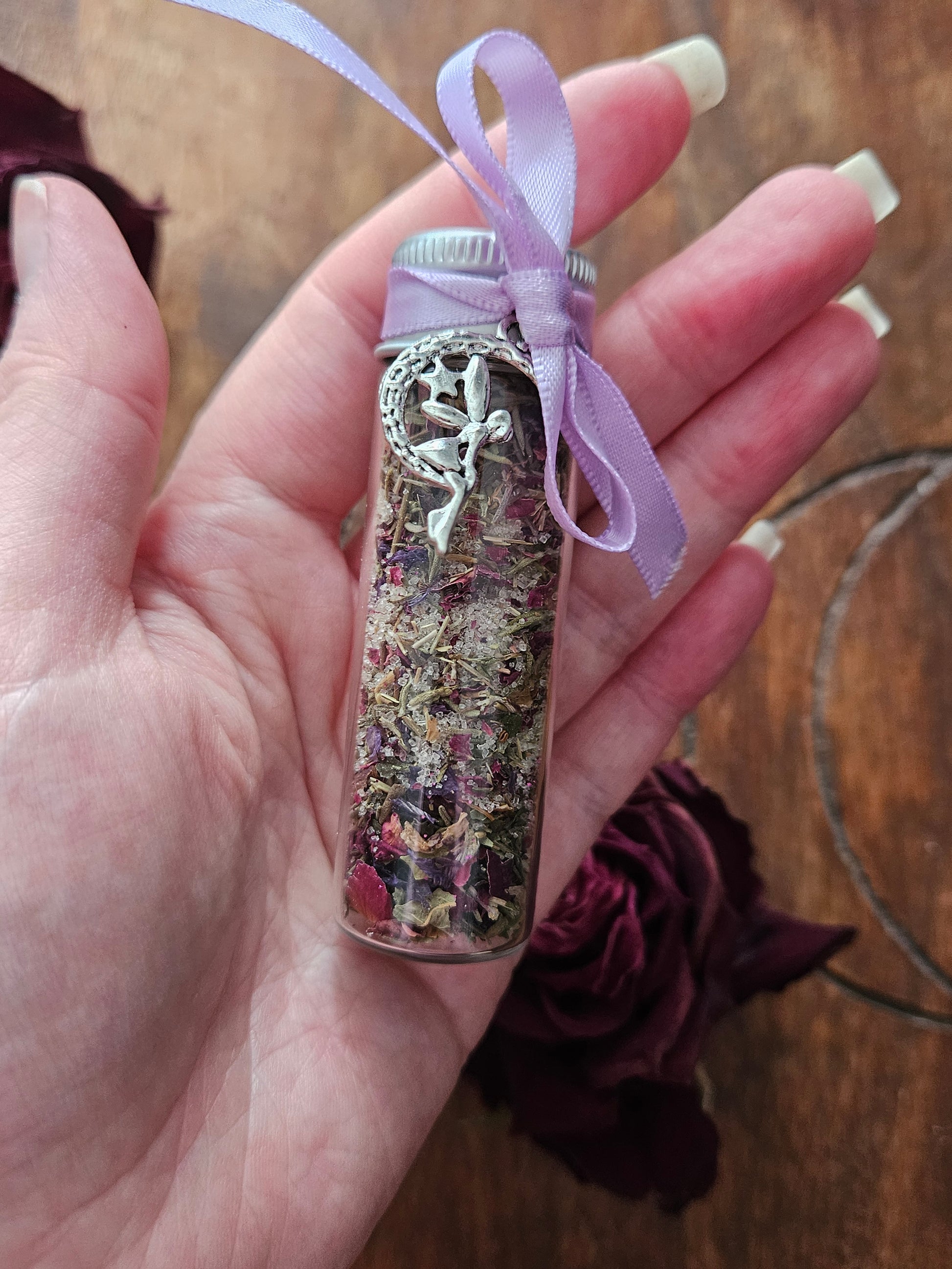 Glass vial with Fairy Charm measures approx 7x2cm. Contains Sugar, herbs, flowers and biodegradable pink glitter