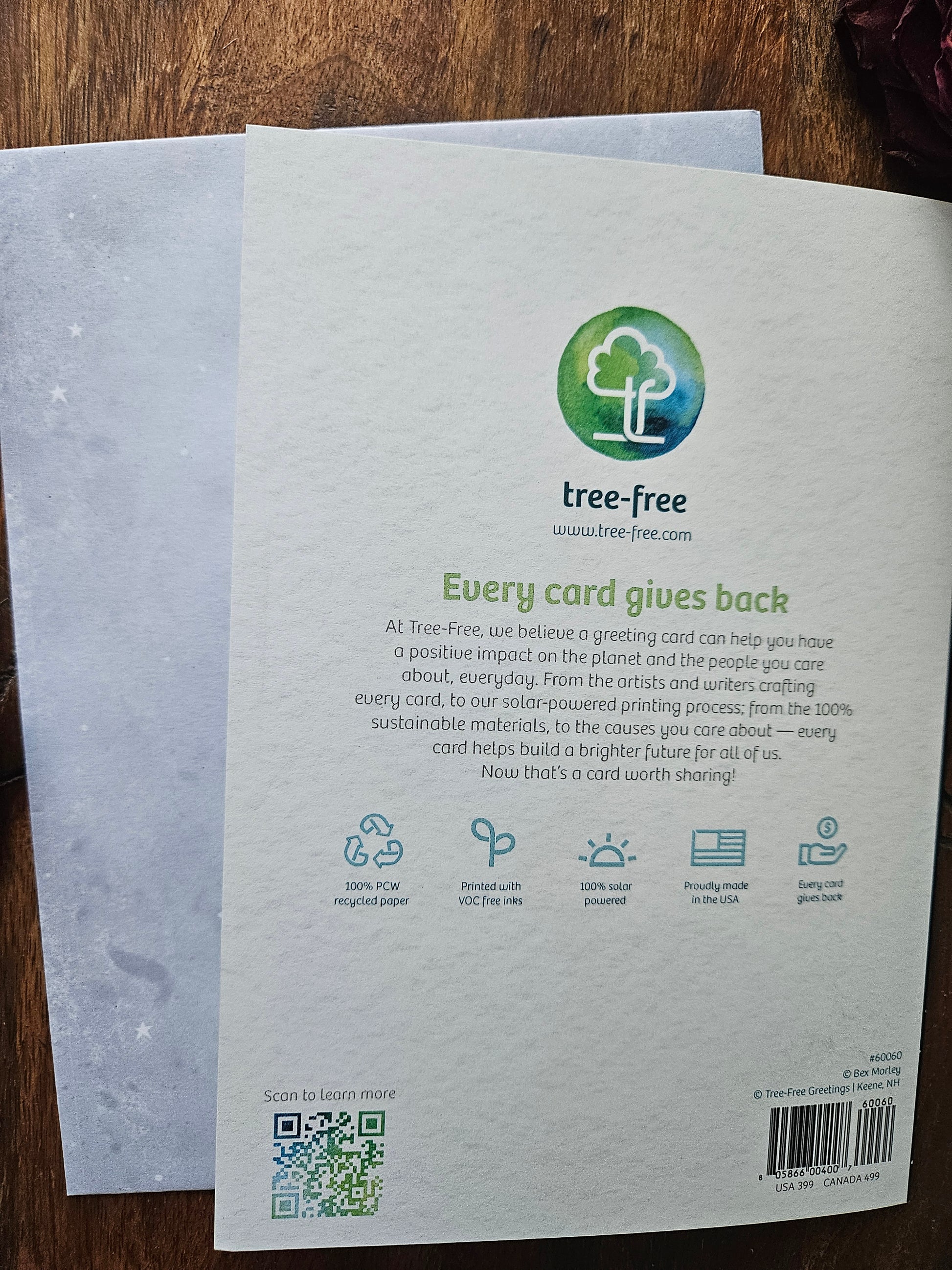 All Tree Free cards and envelopes are made from either 100% renewable non-paper products like Kenaf or Sugar Cane or 100% recycled paper or FSC certified mixed sources and are printed on with soy-based inks which are cleaner for the environment.