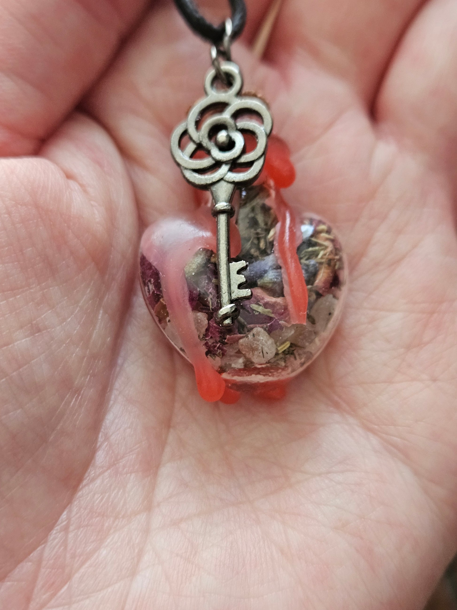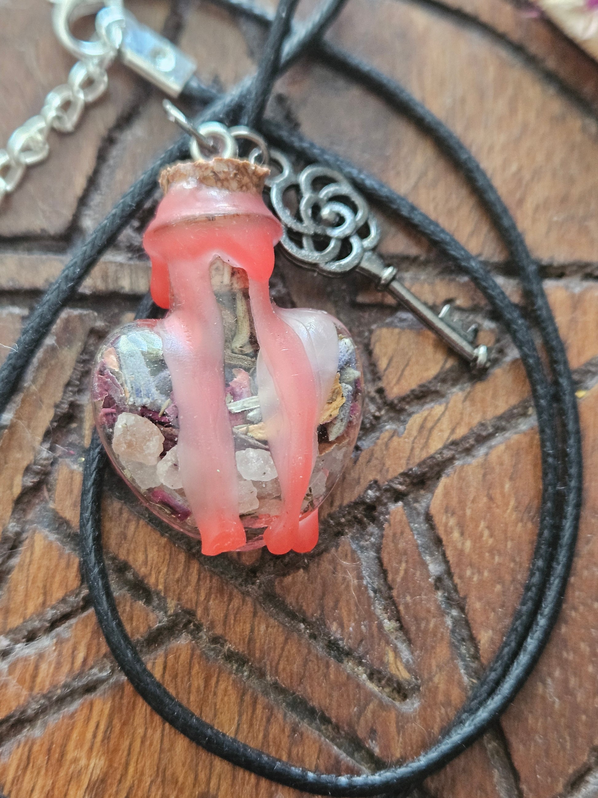 The heart shaped spell jar Measures 3.3cmx2.2cm and has been sealed with red wax. This bottle is connected to a split ring and adorned with a silver tone key. This necklace comes on a black waxed cord 16inches with a 2 inch extender chain.