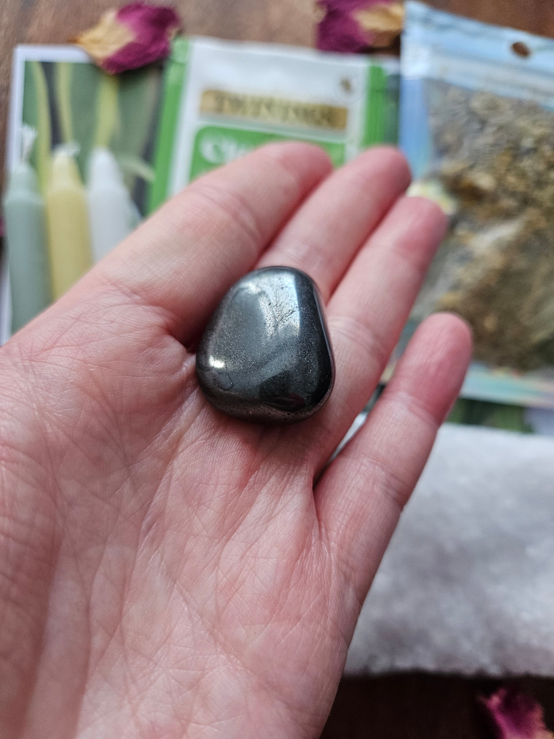 Hematite for its strong grounding and protective properties. It is associated with the return of light and life, helping to transform negative energies and foster new beginnings.