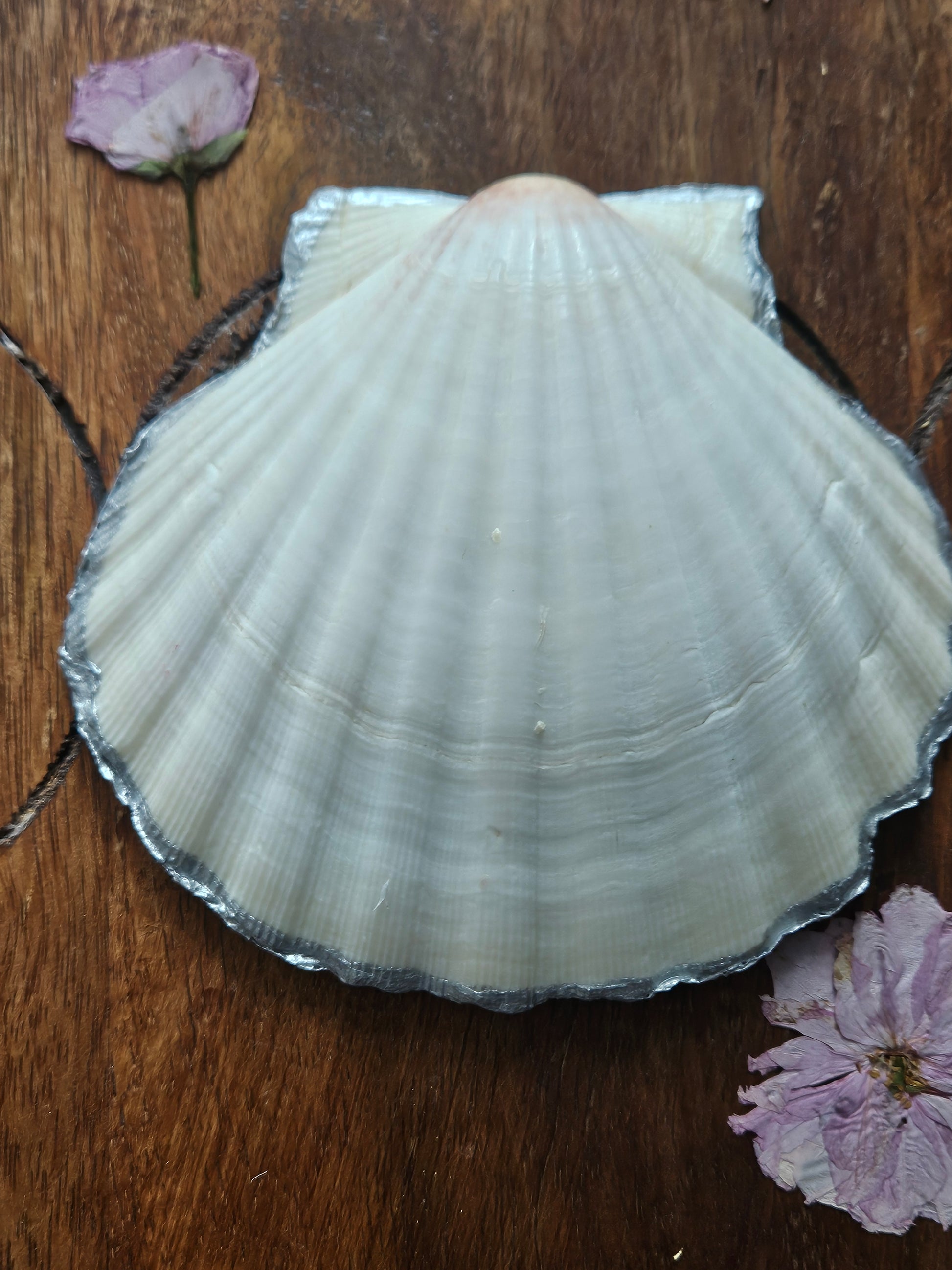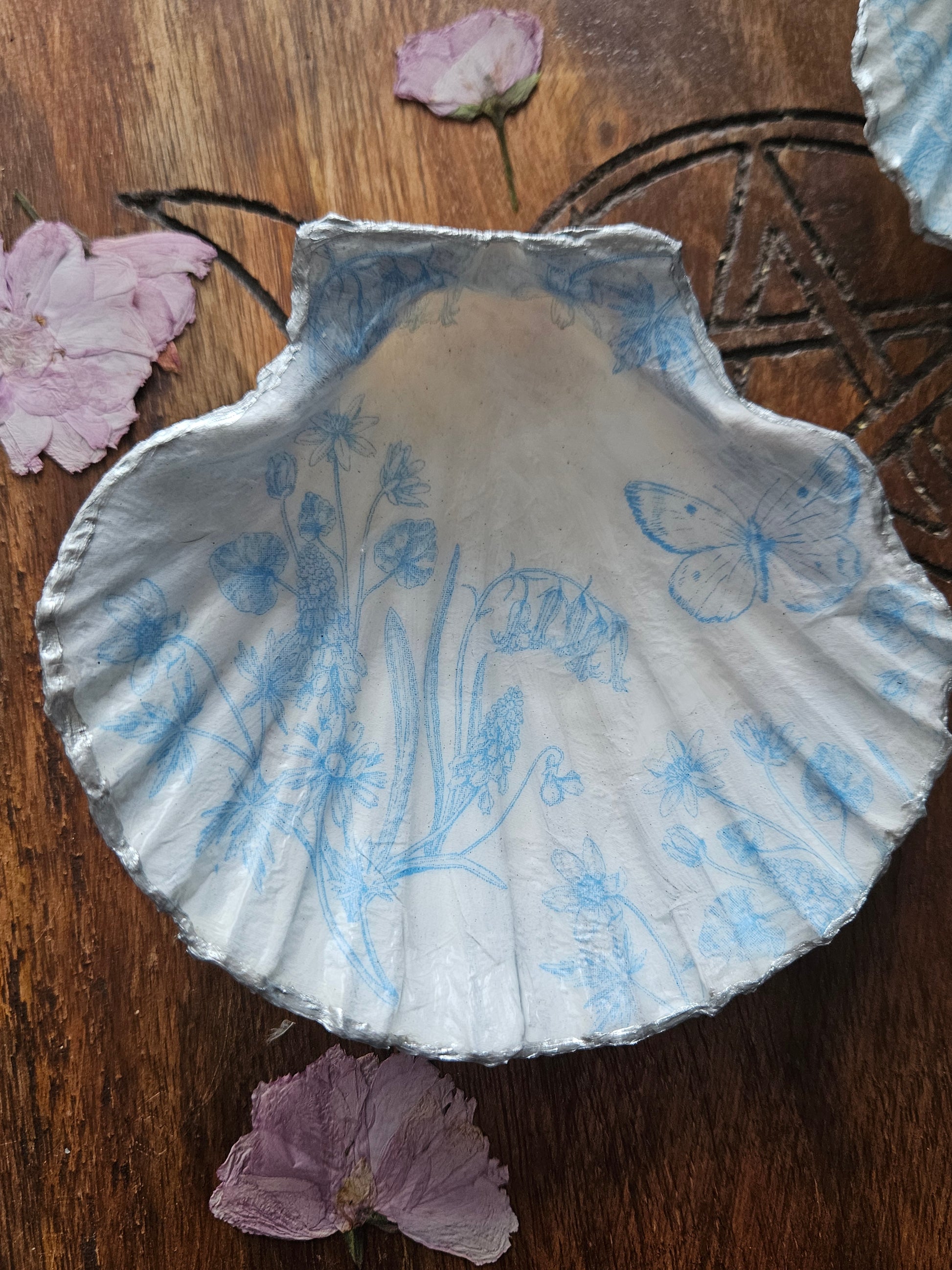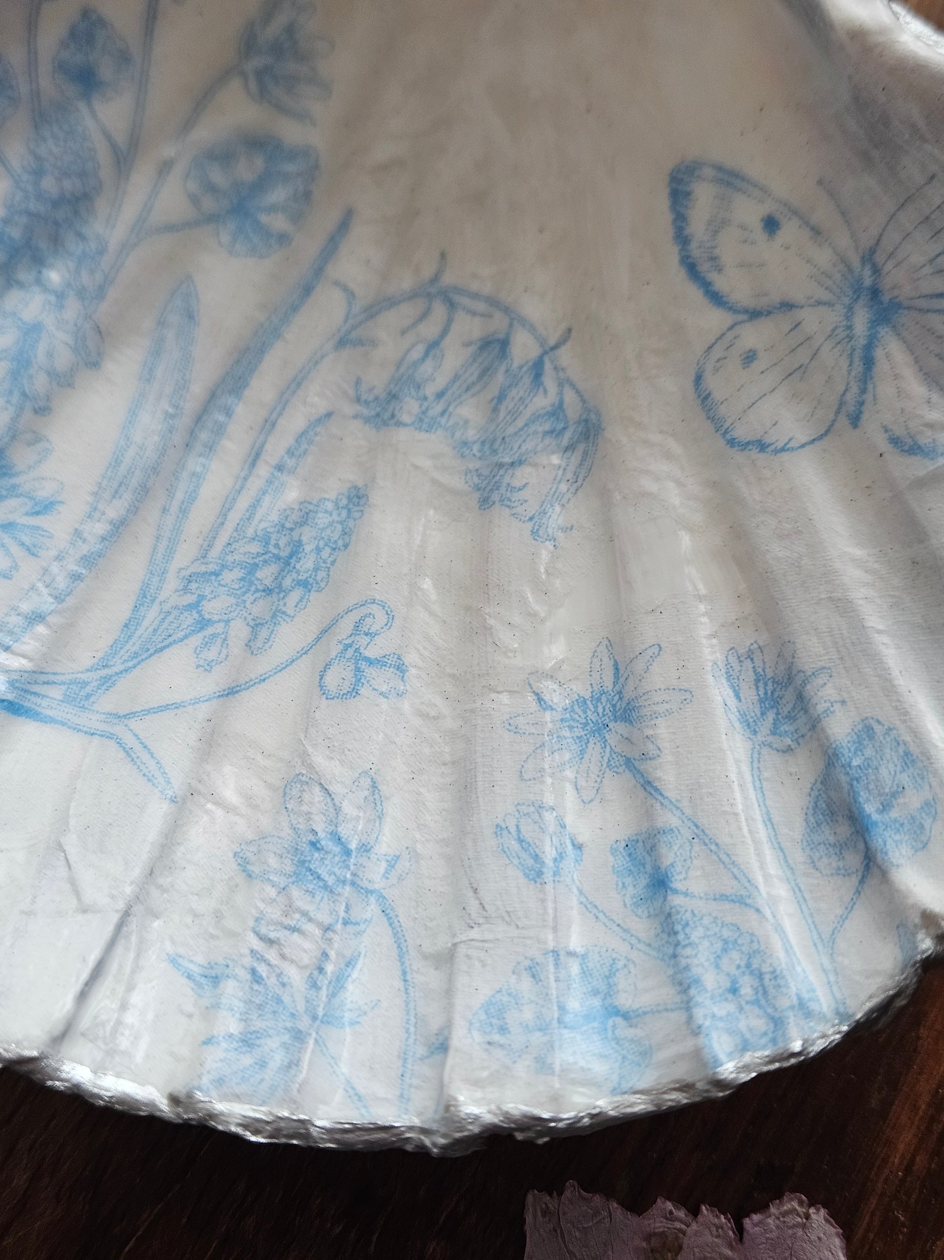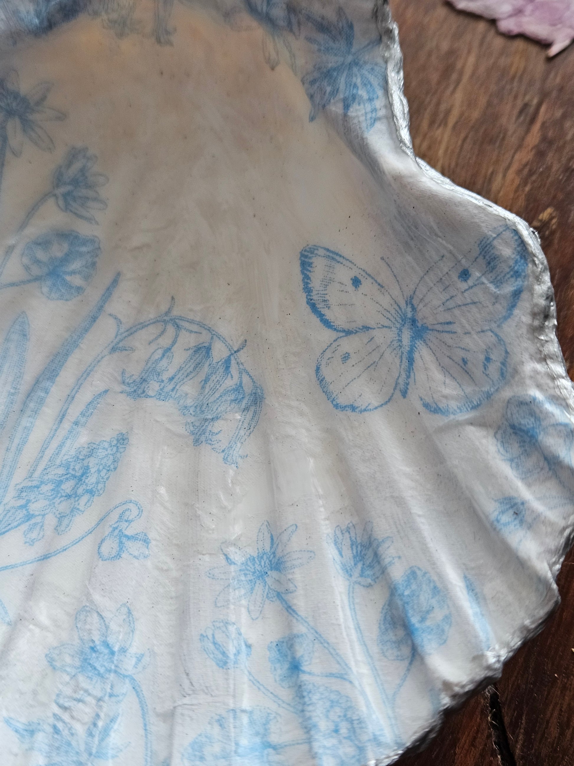 Large Scallop Shell dishes with a Decoupage Design inside. No 2 designs are the same, and the colour of the back of the shells are completely unique.