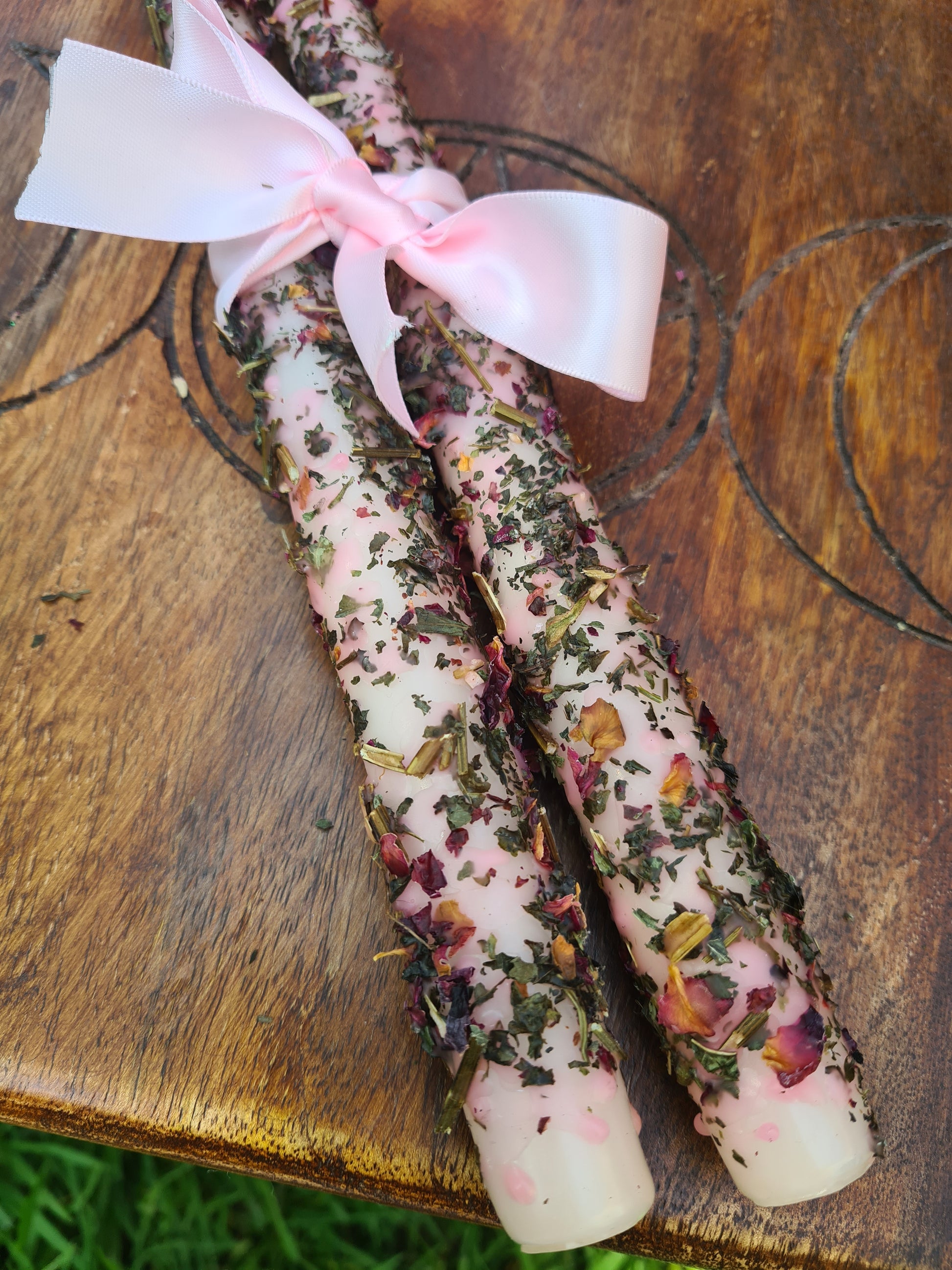 The candles have been annointed with an essential oil corresponding to the candle and then dressed with herbs or flowers to help your spell. The candle is then finally dripped with the same colour wax to seal in the herbs/flowers.