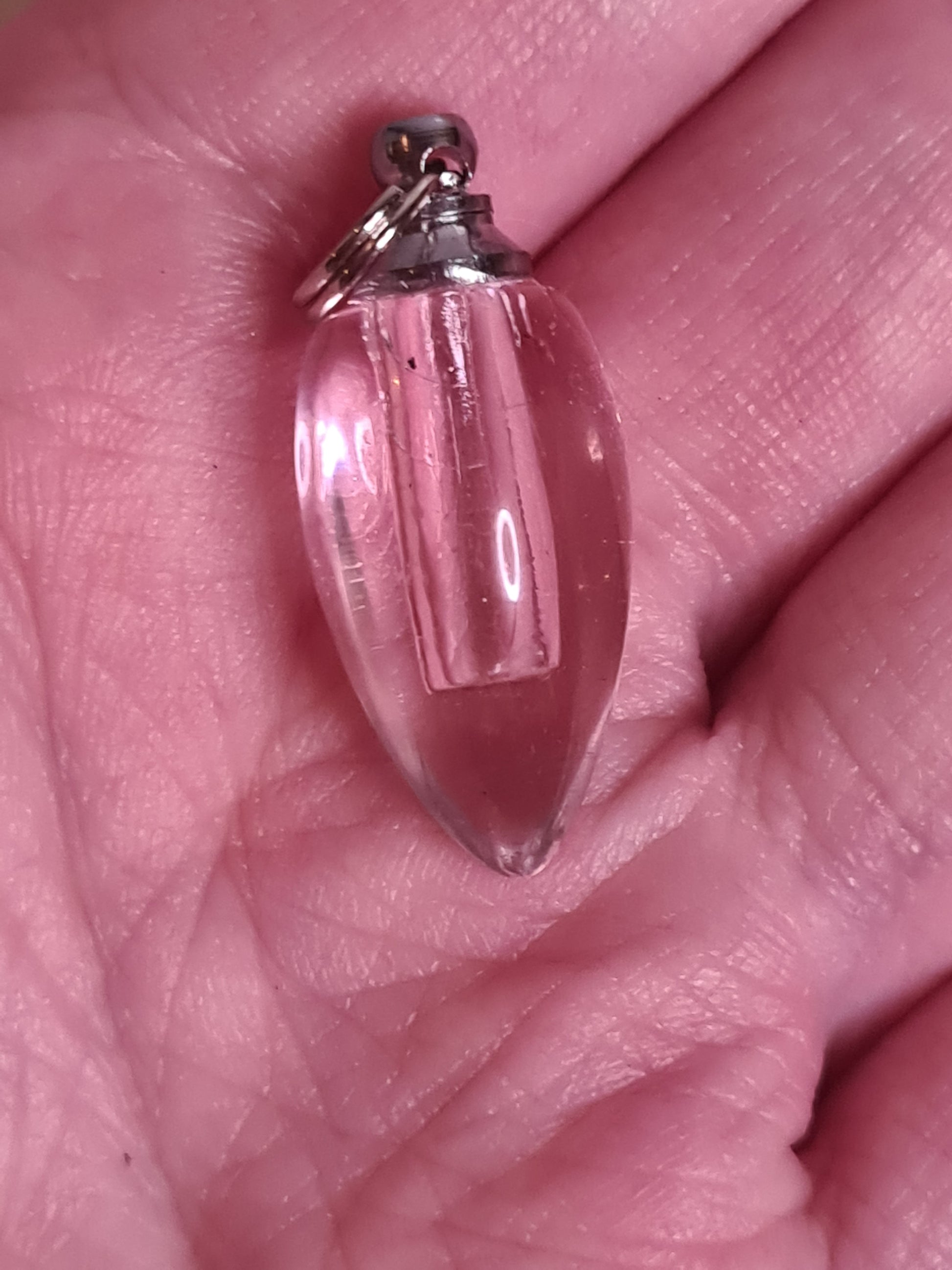 Comes on a 16inch black cord with 2 inch extender with a clear glass vial with contains a couple of drops of lavender which can be used for the fragrance when in need or dabbed on the pulse points (refillable).