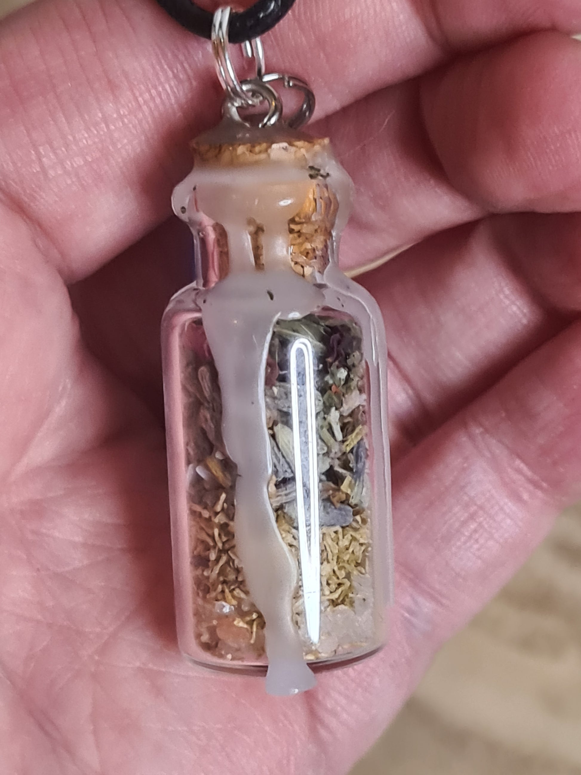 This beautiful luxury spell jar pendants contains a spell jar with herbs, salts and flowers which has been spell cast to help with anxiety. Also comes with 1 glass vial containing a few drops of organic lavender essential oil. Glass vial in your choice of blue, green, pink, purple, yellow.
