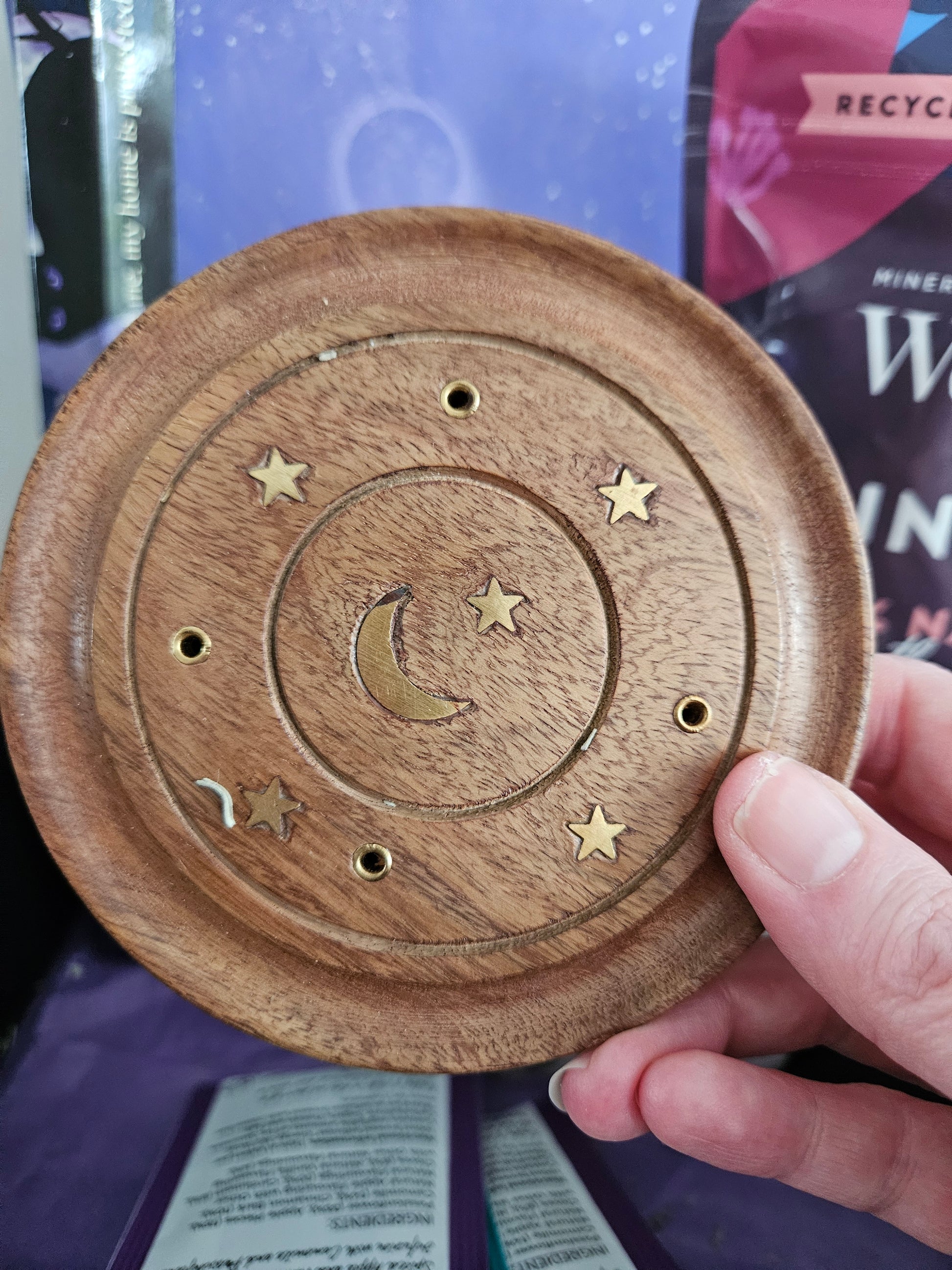 1x Small Incense Holder Burner Plate. Moon and star inlay. Approximately 9.9 cm in diameter (4 inches). This mini disc allows up to four Indian incense sticks to be burned at the same time. Each hole for the incense also has a little brass surround which helps support the incense sticks.