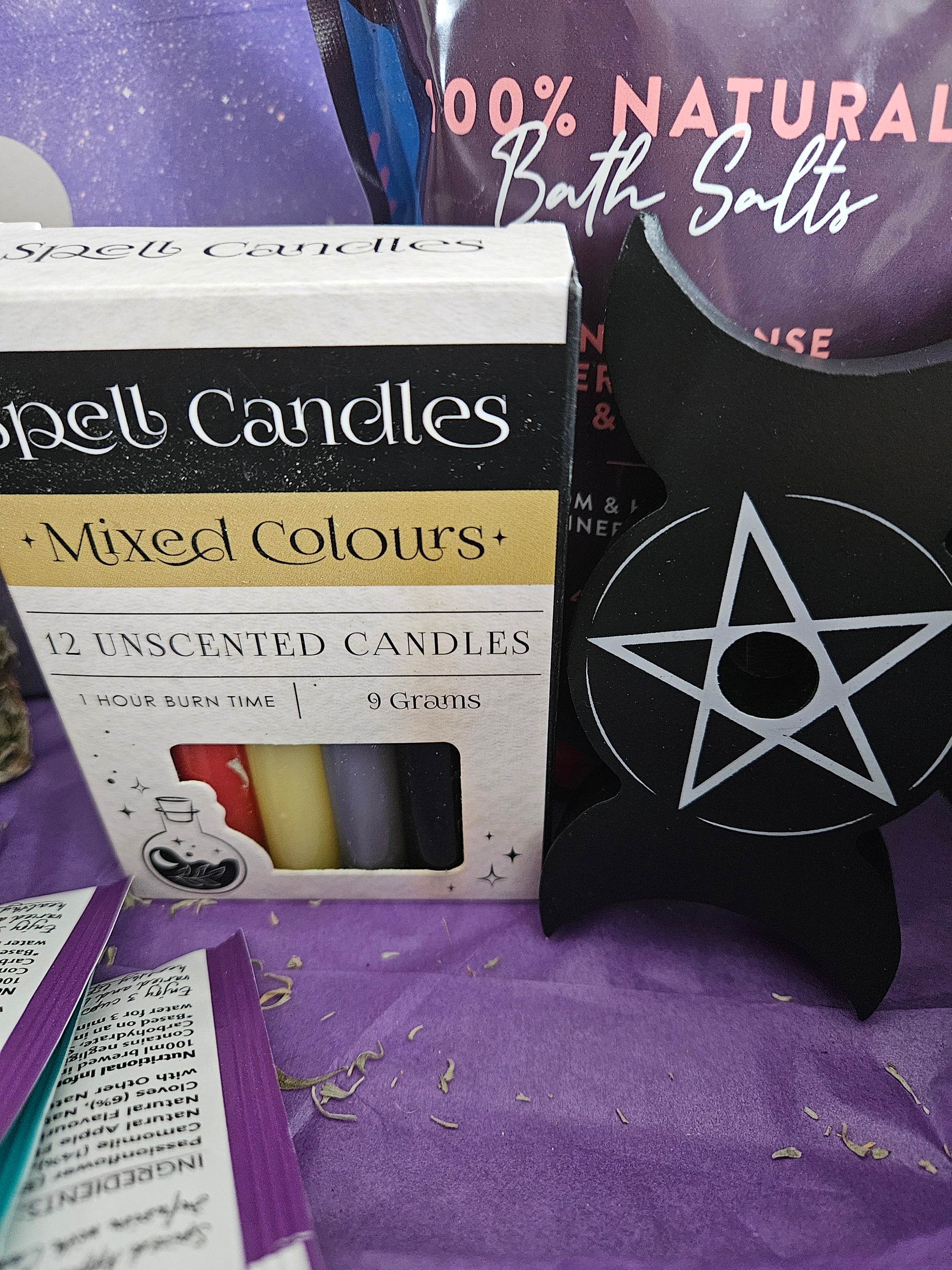 Pack of 12 mixed spell candles containing the following colours; x2 black for banish negativity, x2 white for healing, x1 purple for stress less, x1 yellow for happiness, x1 orange for attraction, x1 brown for grounding, x1 red for passion, x1 green for abundance, x1 pink for self love and x1 blue for harmony.