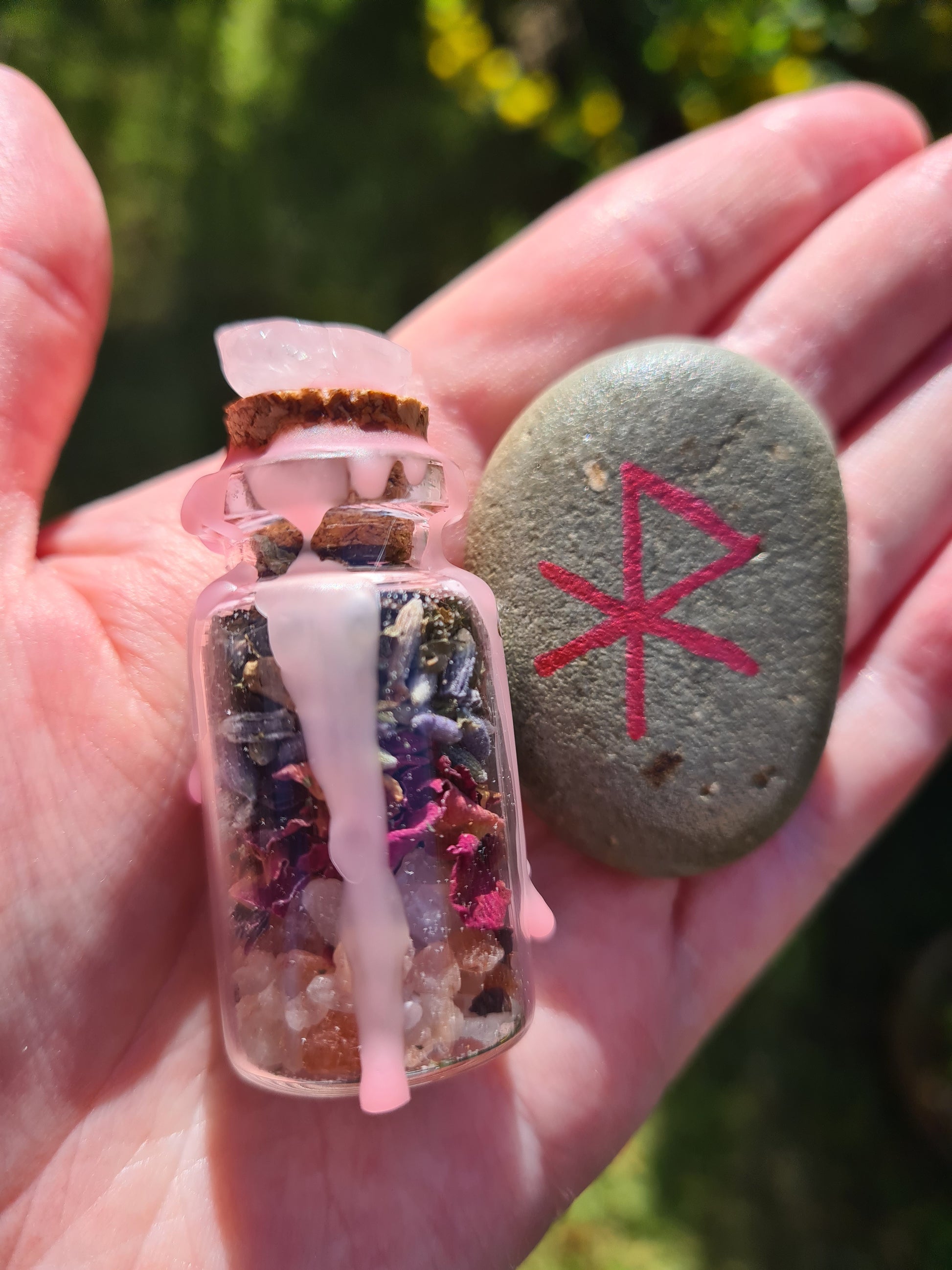 Love spell vial contains Rose Quartz and Amethyst chips, salt and herbs for love and to attract your spiritual love. The jar also comes with a Seastone with a pink Love Bind Rune. The jar and stone will be charged under the moon ready for you to use. I recommend carrying with you and or holding it during meditation. I recommend regularly charging your vial under a New or Waxing moon. Spell vial measures approximately 4.5cm x 2cm