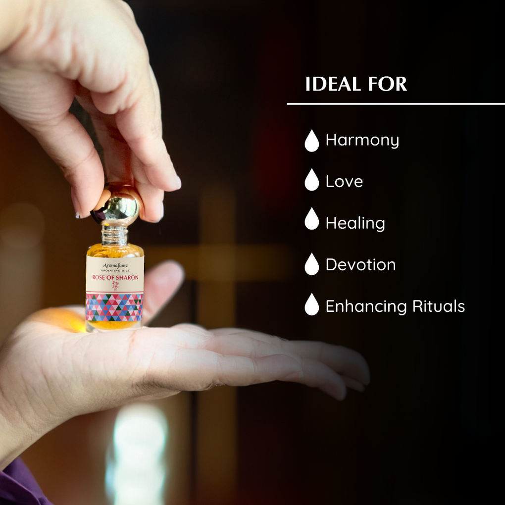 Aromafume's Rose of Sharon Anointing Oil combines biblical ingredients with blessed olive oil from Jerusalem, symbolizing love, beauty, and harmony. Rose of Sharon anointing oil can be a way to invoke these qualities in spiritual practices. Virgin olive as a carrier is rich in antioxidants and vitamin E.