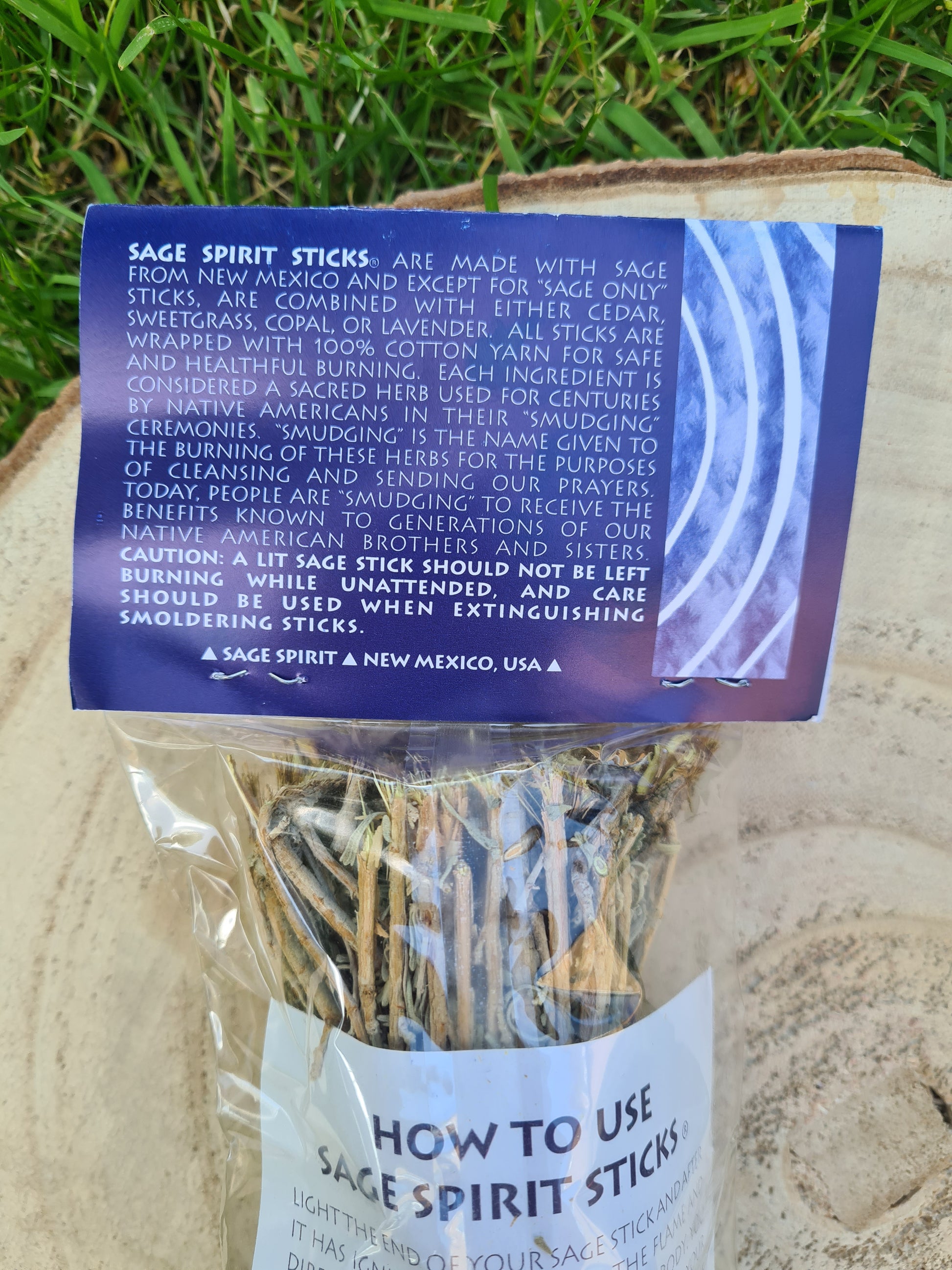 On the Back of the Packet: Sage Spirit Sticks are made with Sage from New Mexico; they are wrapped with 100% cotton yarn for safe and healthful burning. Each ingredient is considered a scared herb used for centuries by Native Americans in their "Smudging" ceremonies. "Smudging" is the name given to the burning of these herbs for the purposes of cleansing and sending our prayers. Today people are "Smudging" to receive the benefits known to generations of our Native American brothers and sisters.
