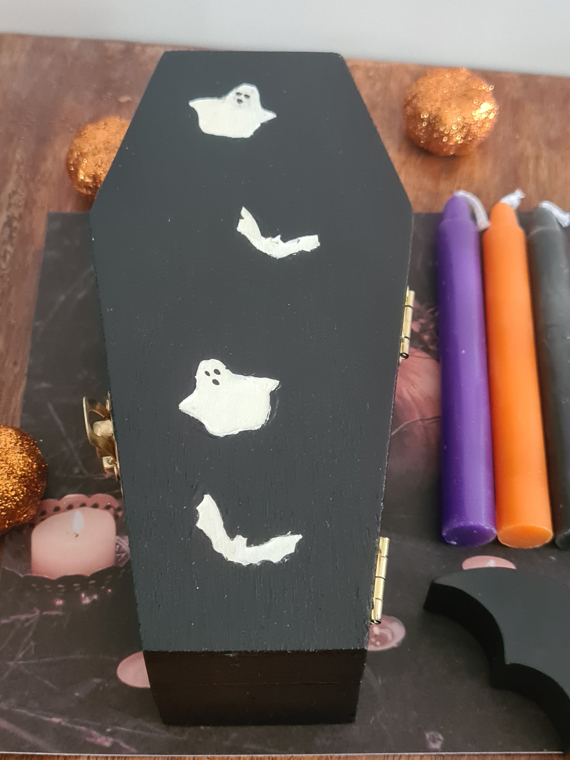 All in a handpainted black wooden coffin with white painted bats and ghosts