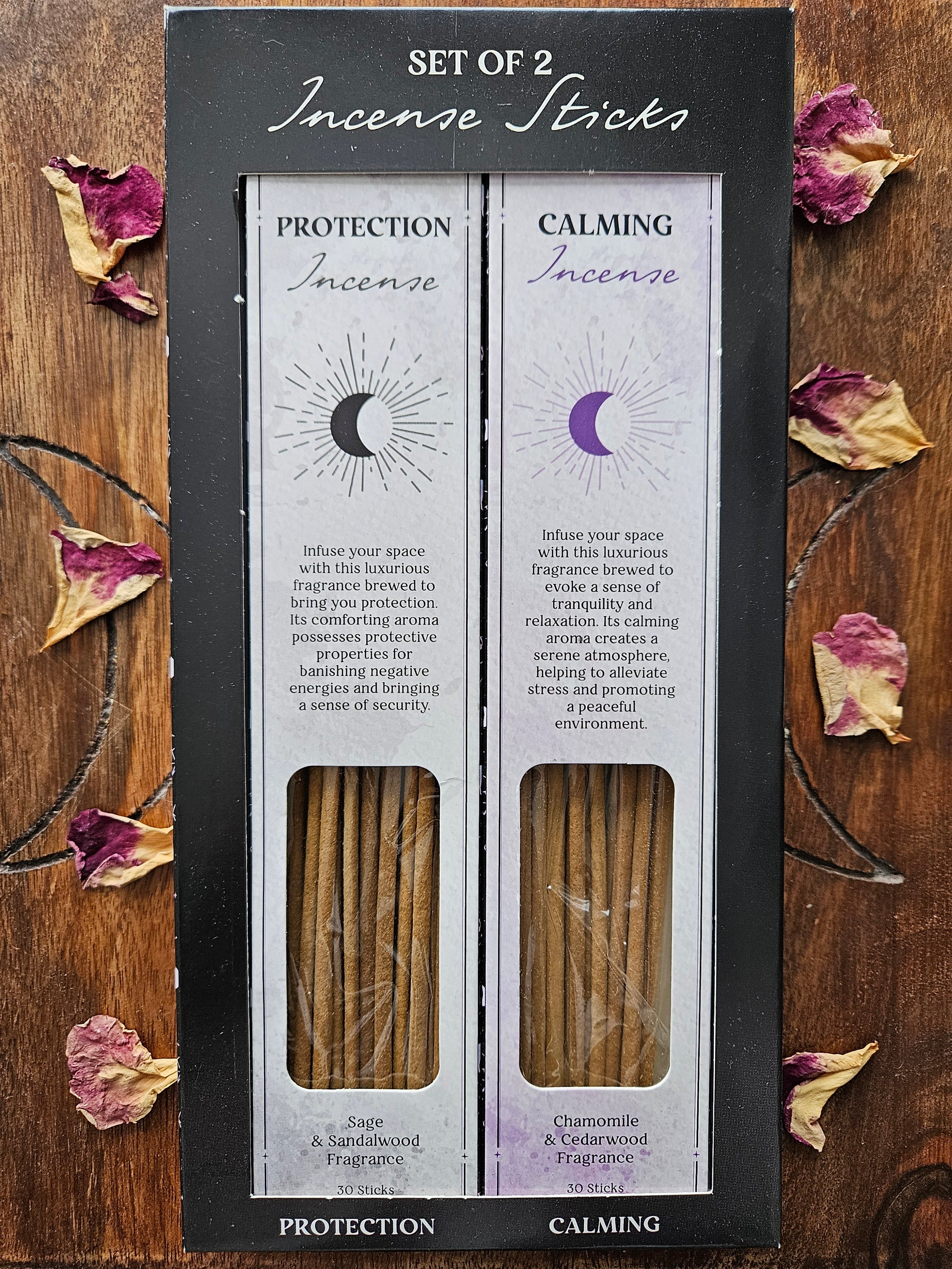 Infuse any space with calming and protective energy with this pack of 2 incense sticks sets. The calming chamomile and cedarwood fragrance is ideal for relieving stress and promoting a peaceful environment, while the sage and sandalwood fragrance possesses protective properties for bringing a sense of security. A perfect gift for lovers of all things mystical. These incense sticks are sold as a set of 2, with 30 sticks of sage and sandalwood (protection) and 30 sticks of chamomile and cedarwood (calming).