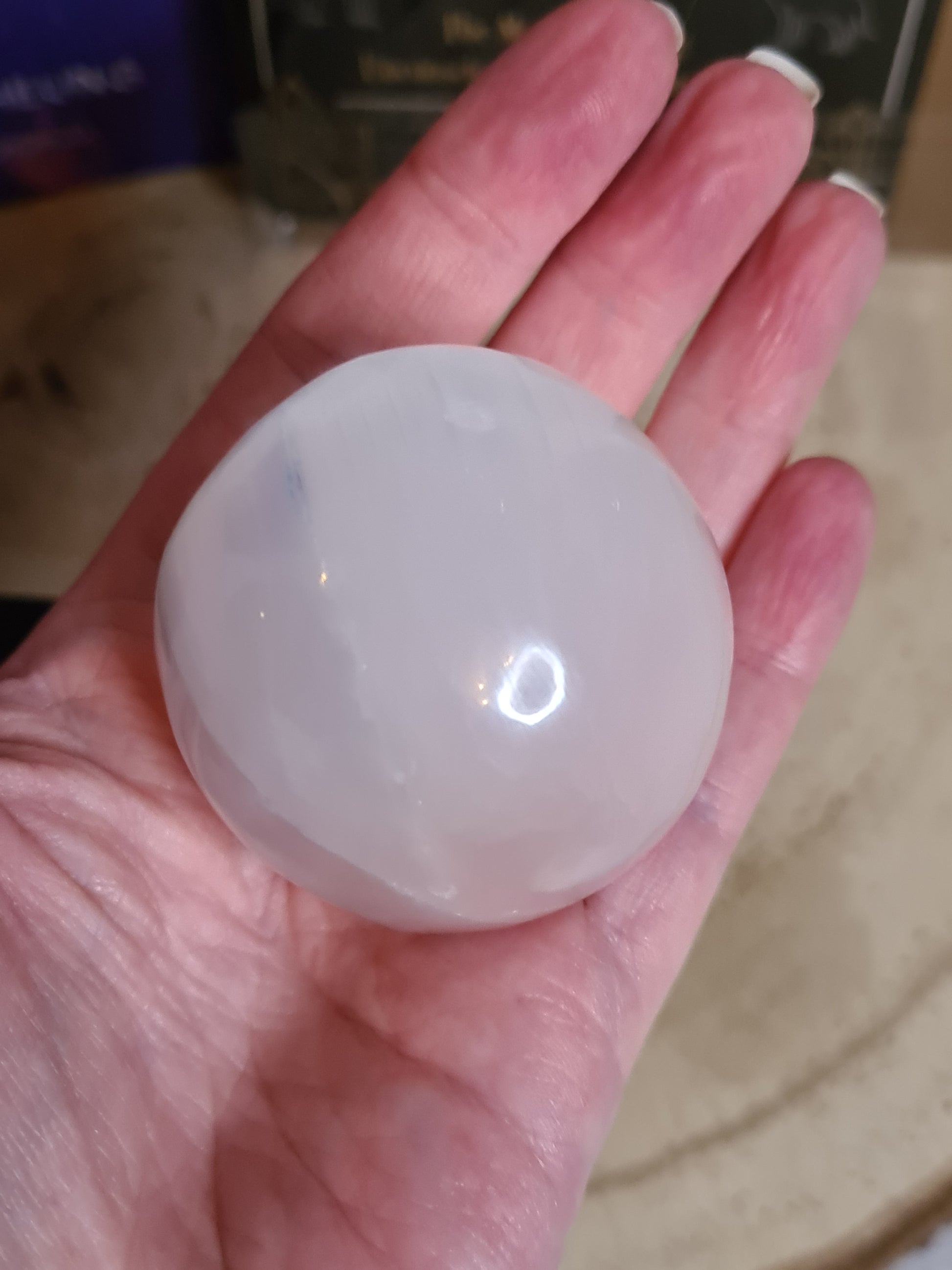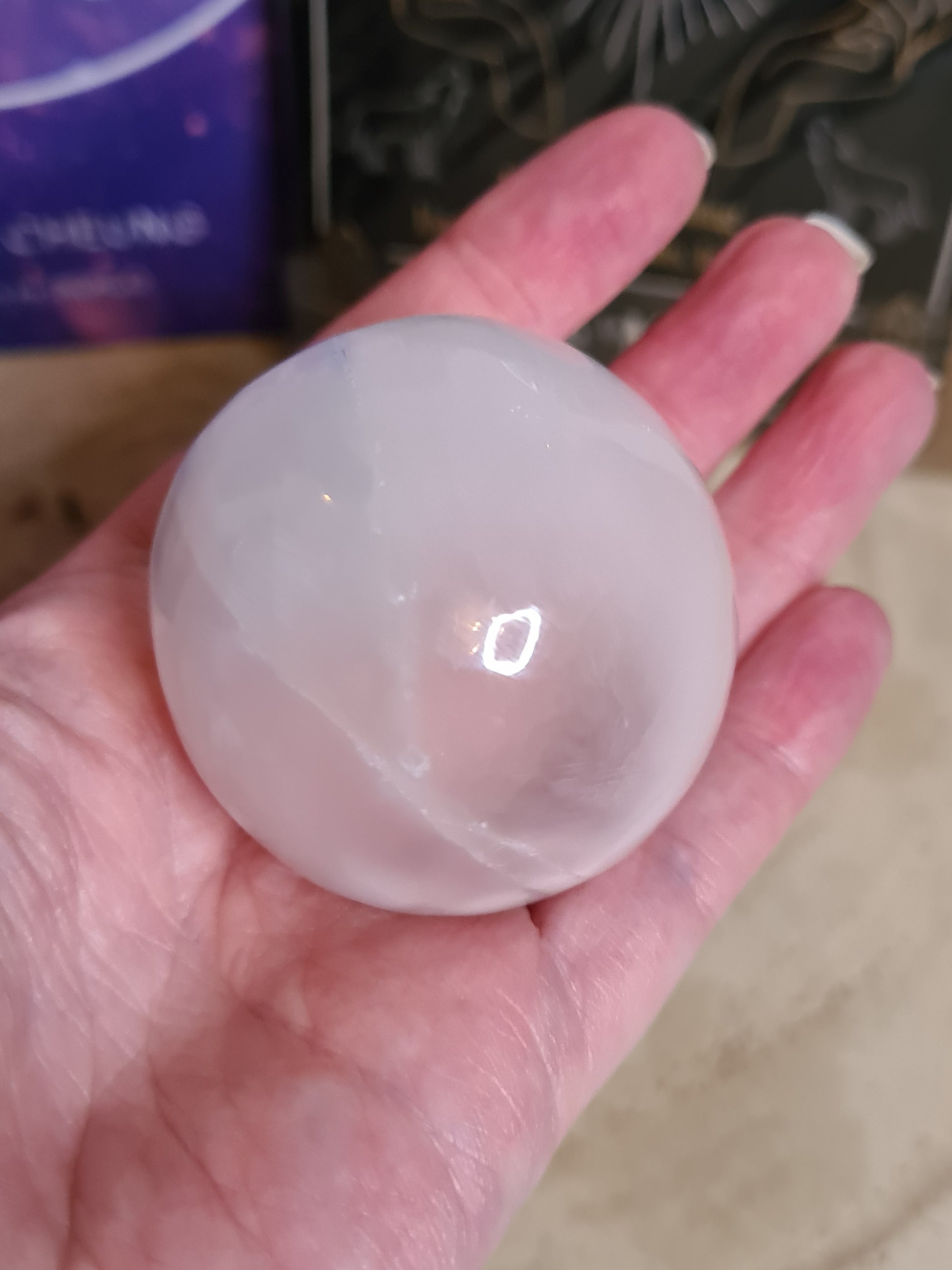 Beautiful selenite sphere which can be used to assist you with connecting to the moon or for scrying. Selenite is a crystal which is commonly associated with having the ability to clear negative emotions and align with the third eye chakra to reach higher planes and activate further senses. H:5cm W:5cm D:5cm