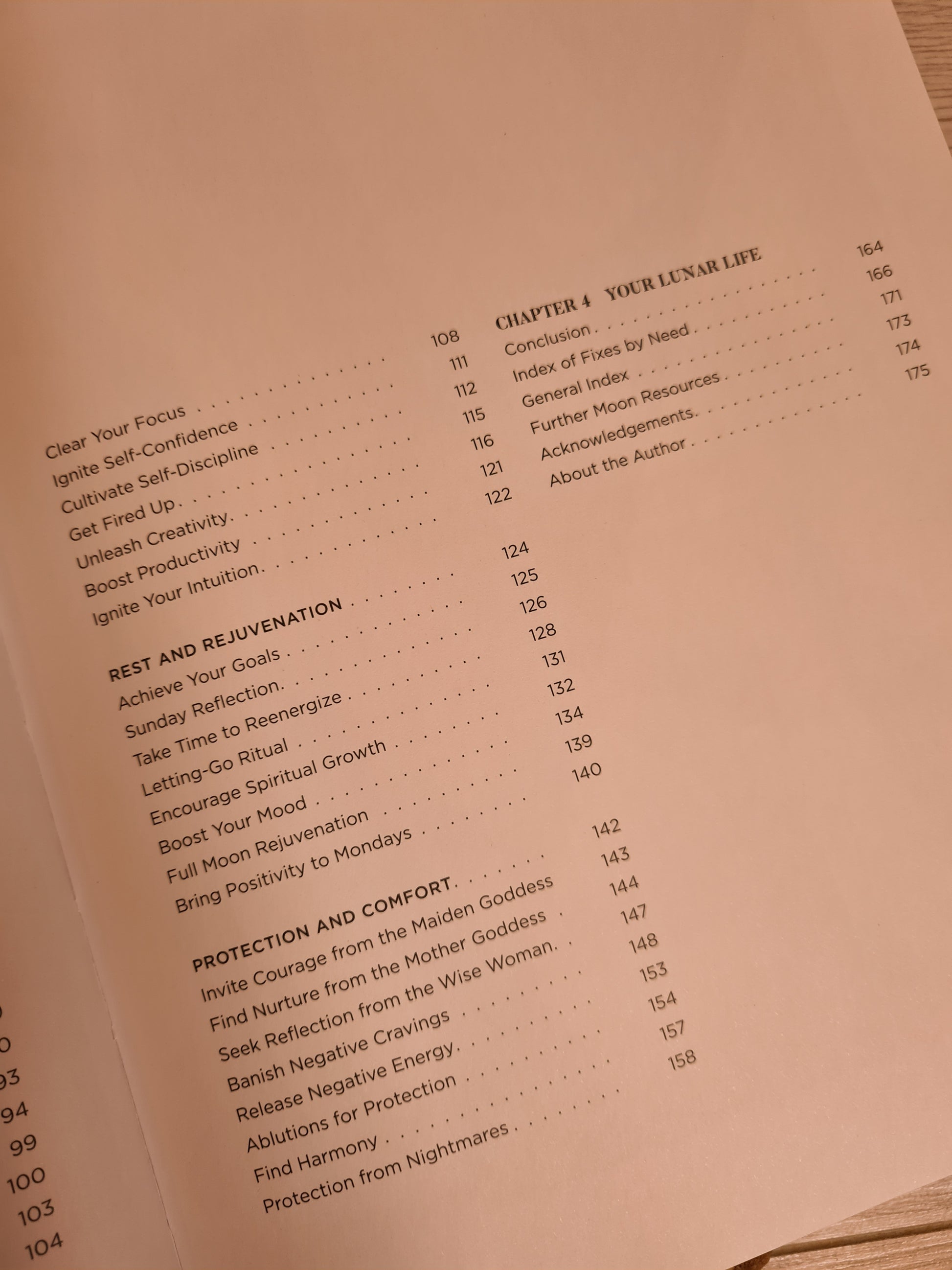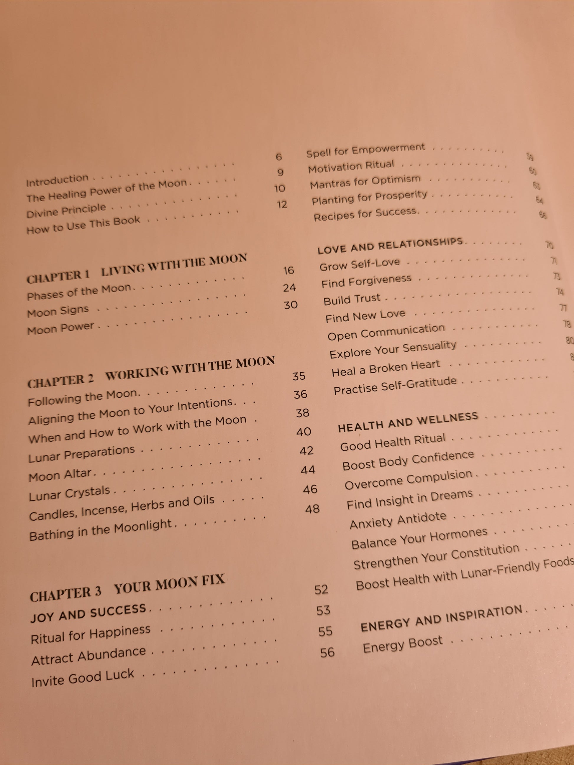 Lunar advice and spells, rituals, meditations and recipes, organized by themes that include Joy and Success, Health and Wellness, and Protection and Comfort