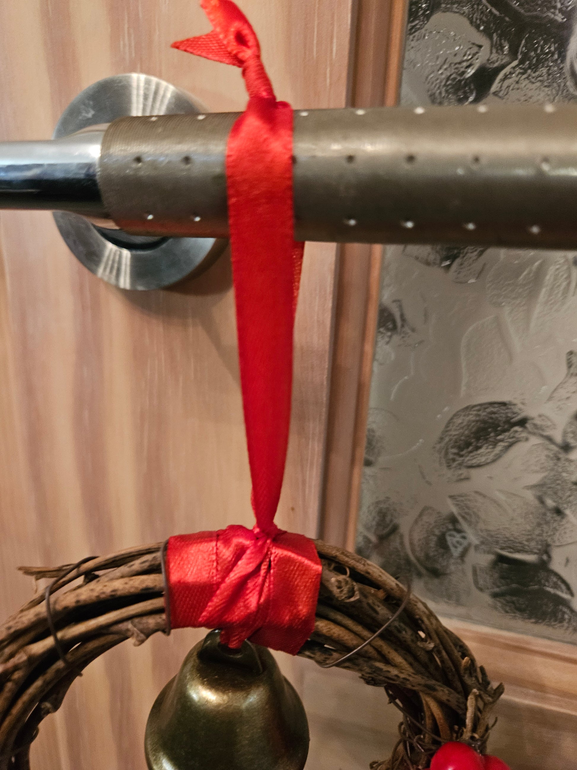 A mini wreath is adorned with mini pine cones and faux red berries. With a beautiful bell in the centre and a red ribbon so you can hang anywhere in your home.